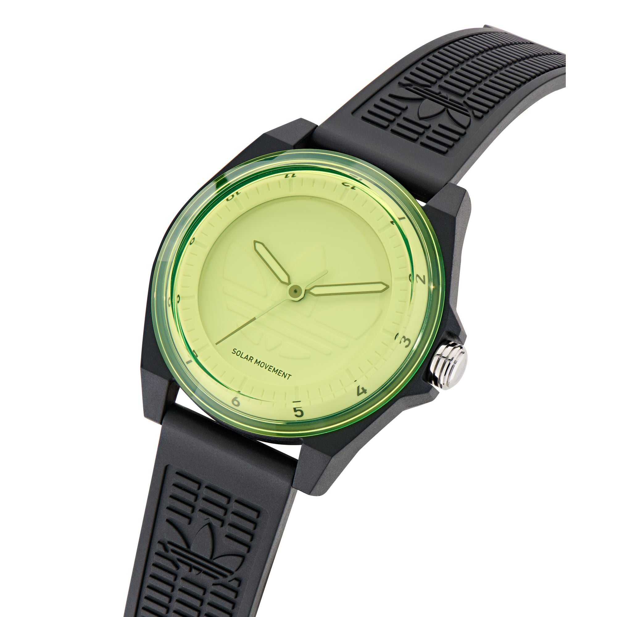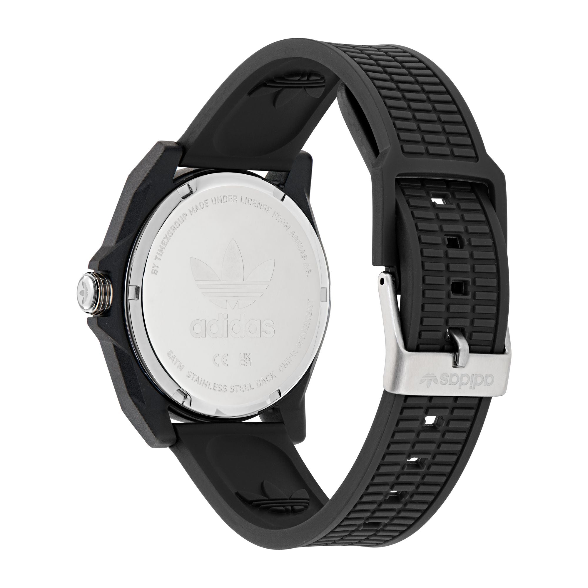 | Armband: | schwarzes Kunststoffband (Resin), Dornschließe Breite: ca. 20 mm Länge der Uhr: ca. 22 cm |