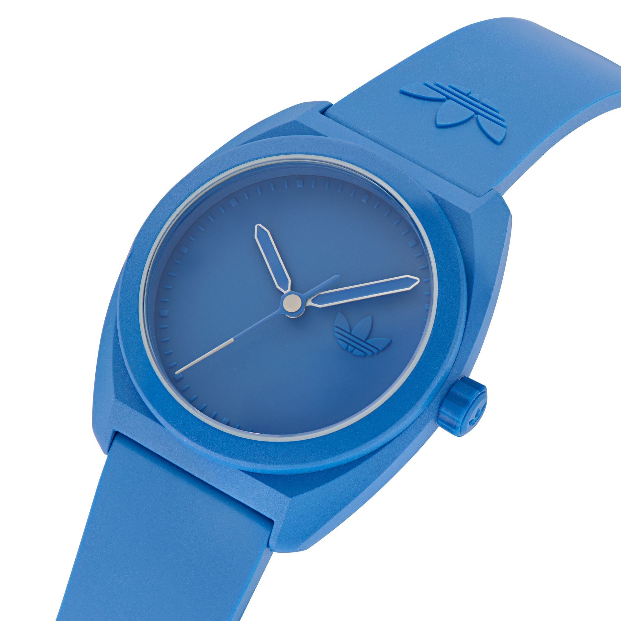 | Armband: | Kunststoffarmband hellblau (Bio-based PU), Dornschließe Breite: ca. 22 mm Länge der Uhr: ca. 22 cm |