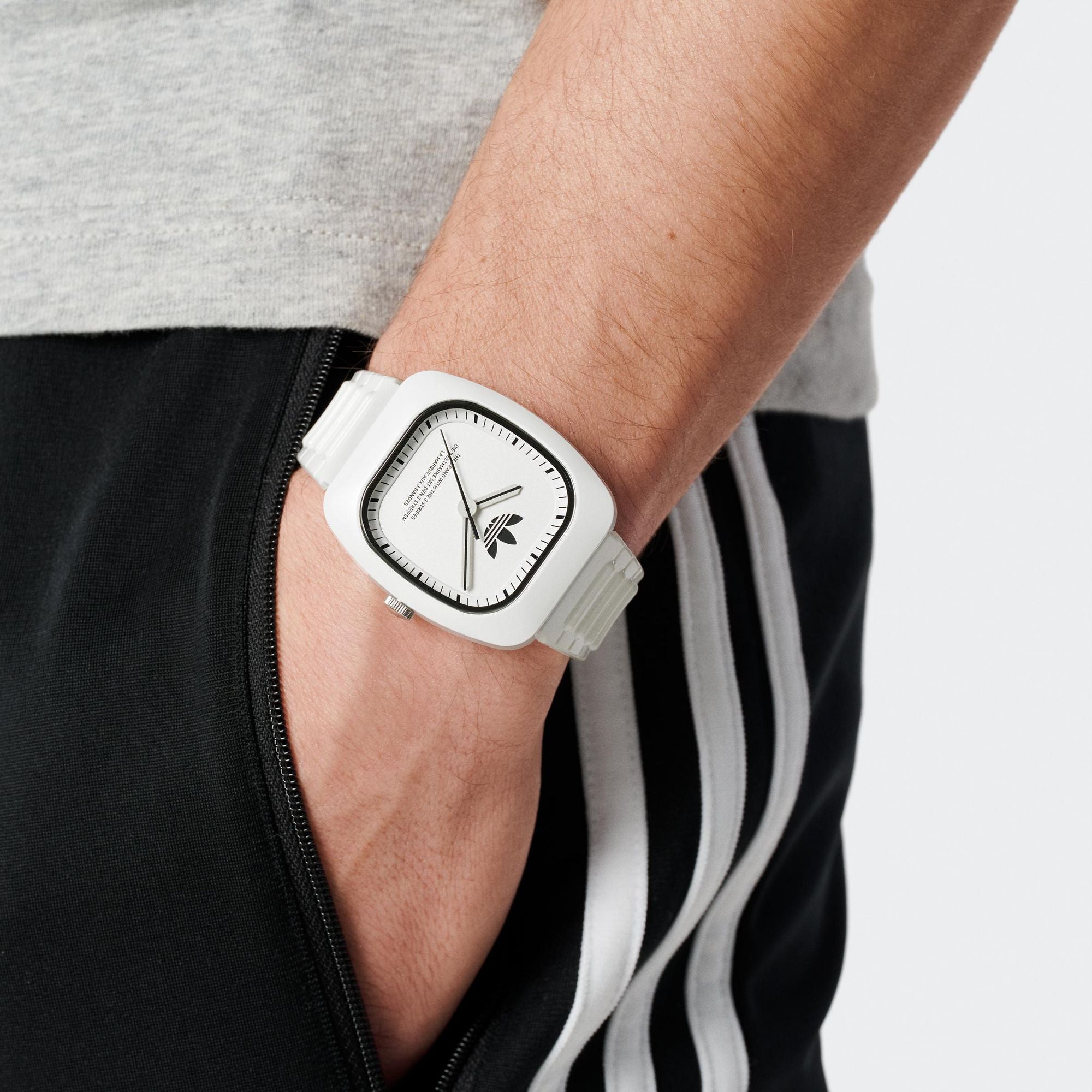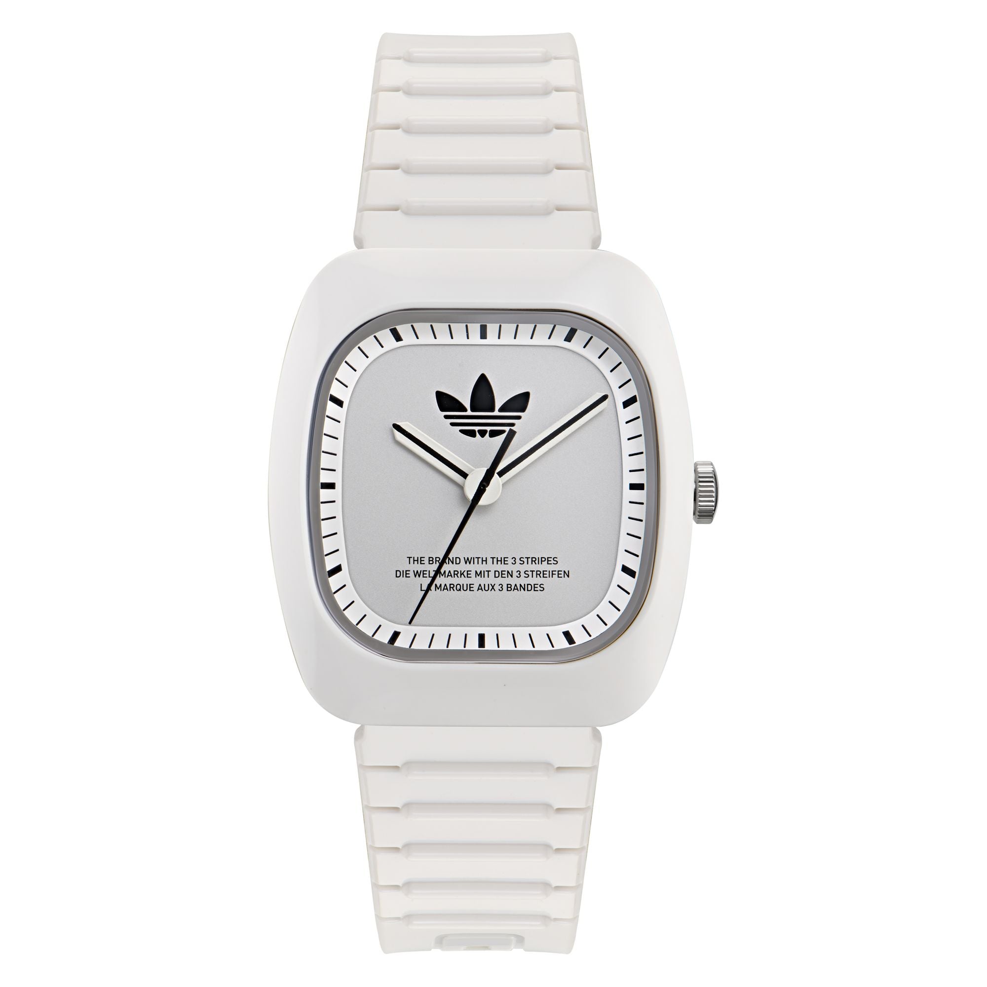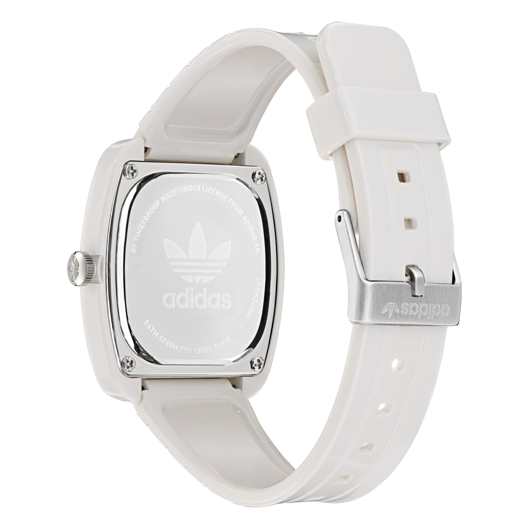 | Armband: | Kunststoffarmband weiß (Bio-based PU), Dornschließe Breite: ca. 20 mm Länge der Uhr: ca. 22 cm |