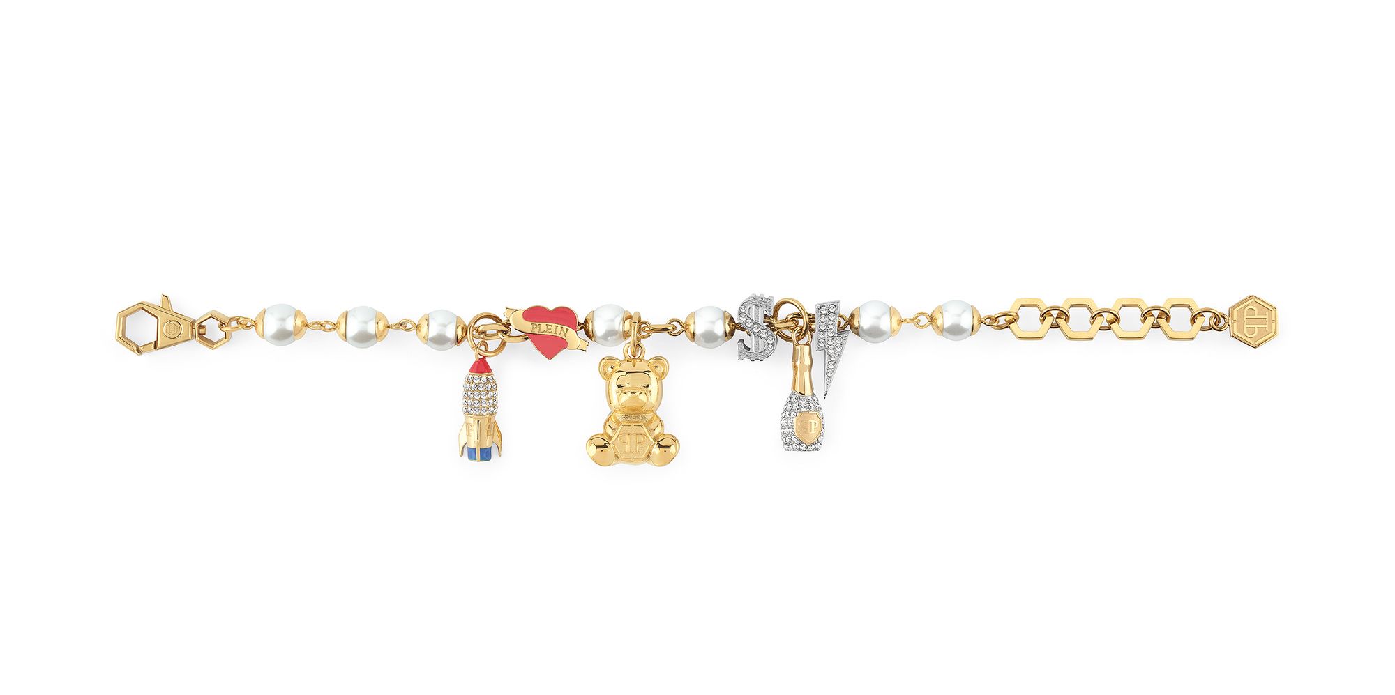 | Material: | Damen Armband aus Edelstahl IP Gold, mit verschiedenen Anhängern (Blitz, Bär, Herz), Anhänger teils mit weissen Preciosa Crystals Elementen verziert Farbe: gold |