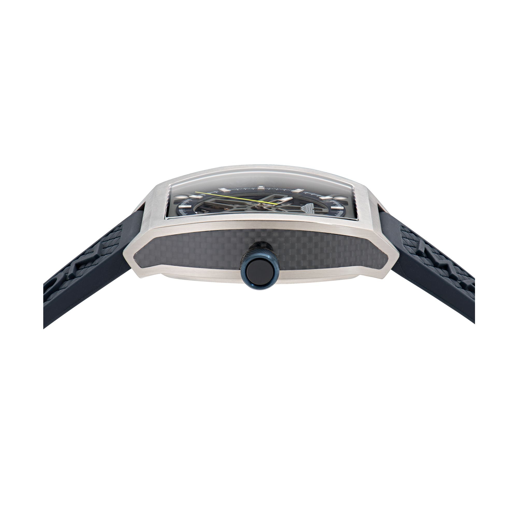 Info: Das markante Design der TRG Automatic verbindet Mechanik mit Aston Martin-inspiriertem Stil. Das offene Skelettzifferblatt, geformt nach den Felgen des DBS GT Zagato, gibt den Blick auf das Uhrwerk unter einem leichten Gehäuse aus Titan und Kohlefaser frei. Die 41 mm große Tonneau-Form vereint Robustheit und Komfort, während das strukturierte, marineblaue Silikonarmband mit seinem Design die Sitznähte von Aston Martin aufgreift. Mit Saphirglas veredelt, ist die TRG die perfekte Verschmelzung von Technik und Eleganz. Der transparente Gehäuseboden gibt den Blick auf das Uhrwerk und einen Rotor in Aston Martins Kultfarbe Podium Green frei und setzt damit ein charakteristisches Detail, das Tradition und Innovation verbindet.