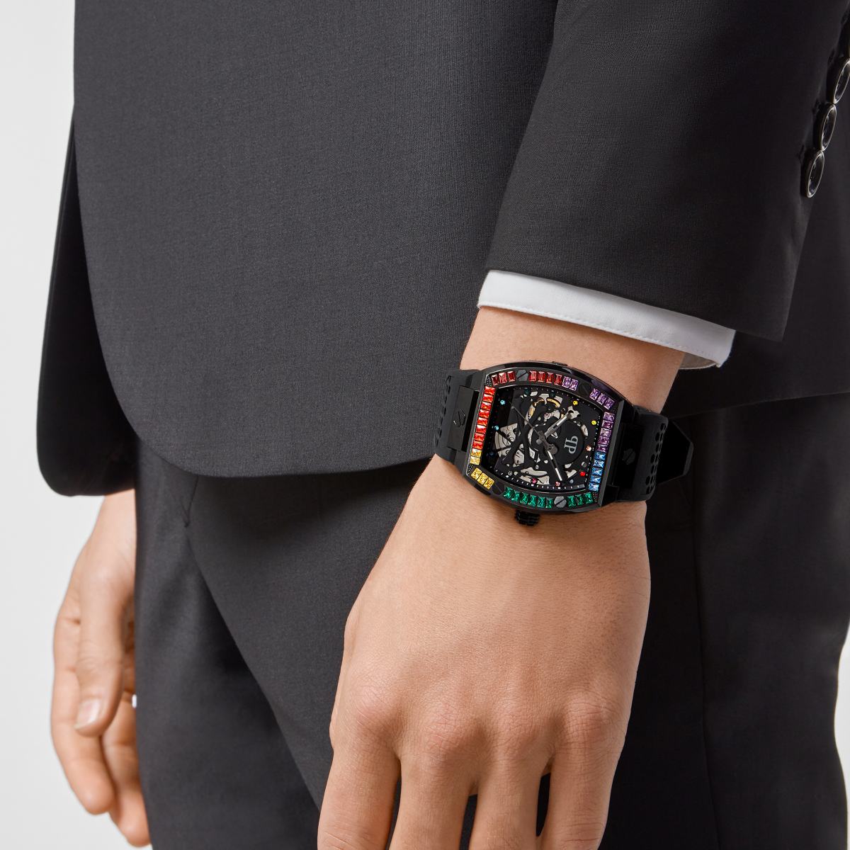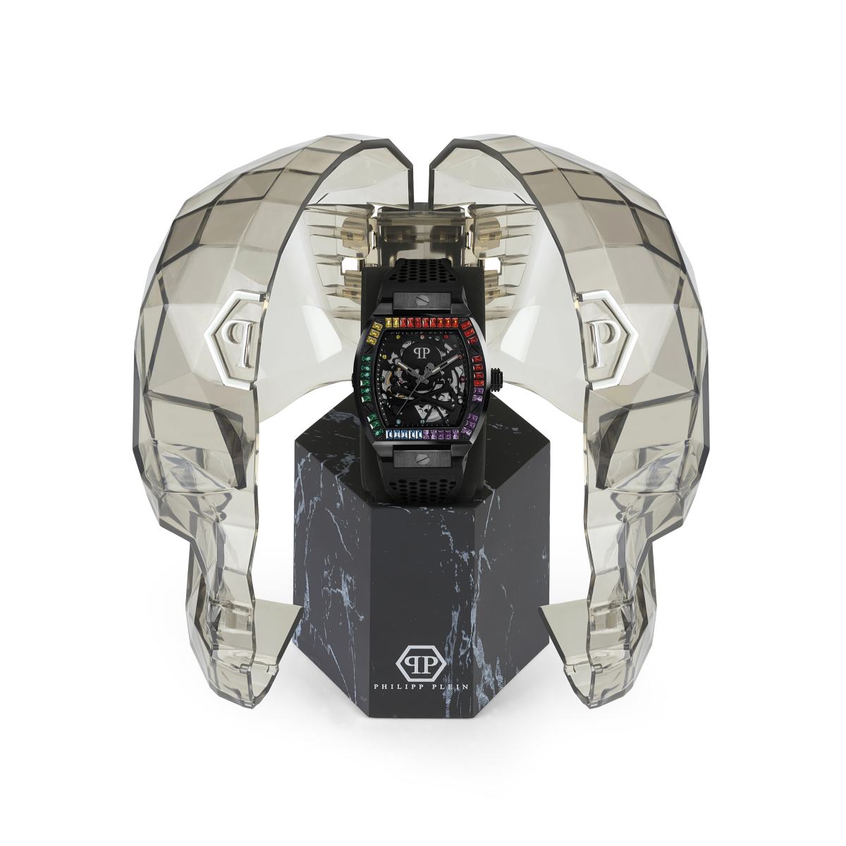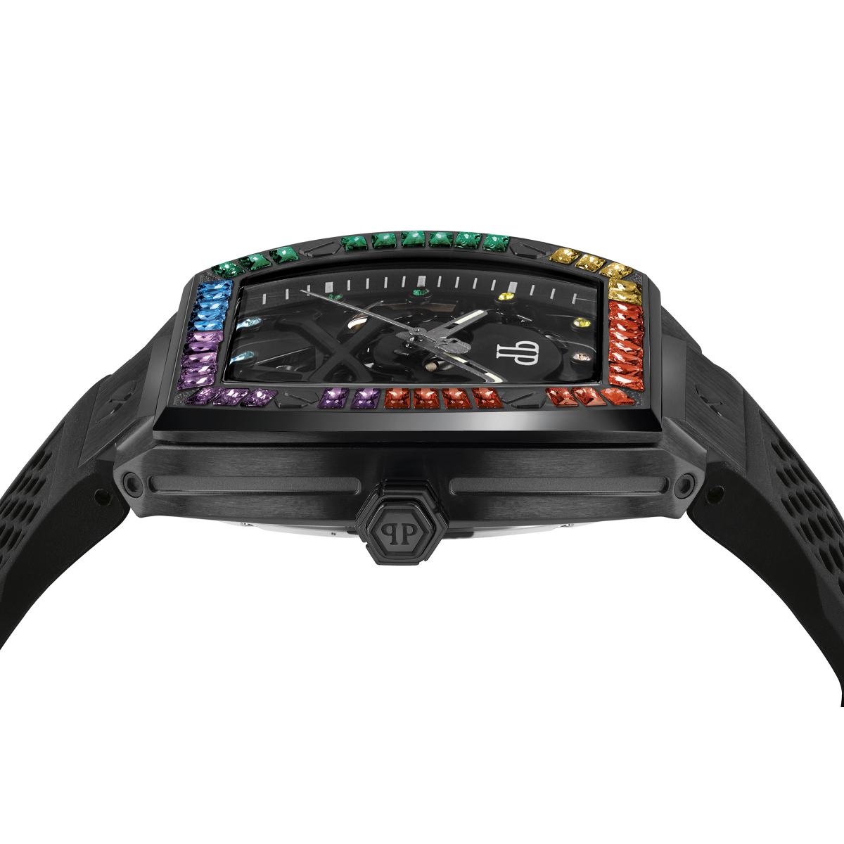 Inspiriert von der $keleton-Sneaker-Kollektion, verbindet der Zeitmesser höchste Uhrmacherkunst mit einem futuristischen Designkonzept. Das raffinierte automatische Skelettwerk ist sichtbar durch das ikonische $kullbones-Motiv auf dem Zifferblatt und sorgt für einen sofortigen Wiedererkennungswert. Die Markenidentität wird außerdem bestätigt durch das PP-Logo auf der Stirn des $kull und durch das Philipp Plein-Logo auf der 12-Uhr-Position auf der Innenseite der Lünette. Die durch Sechskantschrauben akzentuierte Lünette wird bereichert durch einen luxuriösen Kohlefaser-Effekt oder ein leuchtendes Setting aus mehrfarbigen Baguette-Kristallen, die sich in den Indexen wiederfinden. Die sechseckige Form kehrt in den Vertiefungen des futuristischen 3D-gedruckten Silikonarmbandes wieder.
