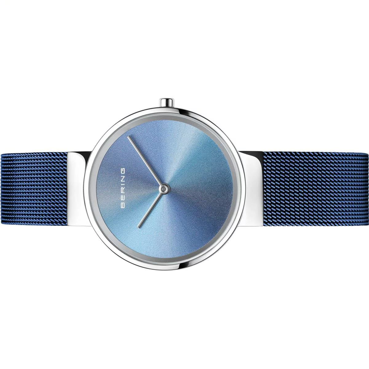 | Armband: | Meshband blau, Breite: ca. 1,4 cm Länge d.Uhr: 20,5 cm, Druckverschluss mit Sicherheitsbügel |