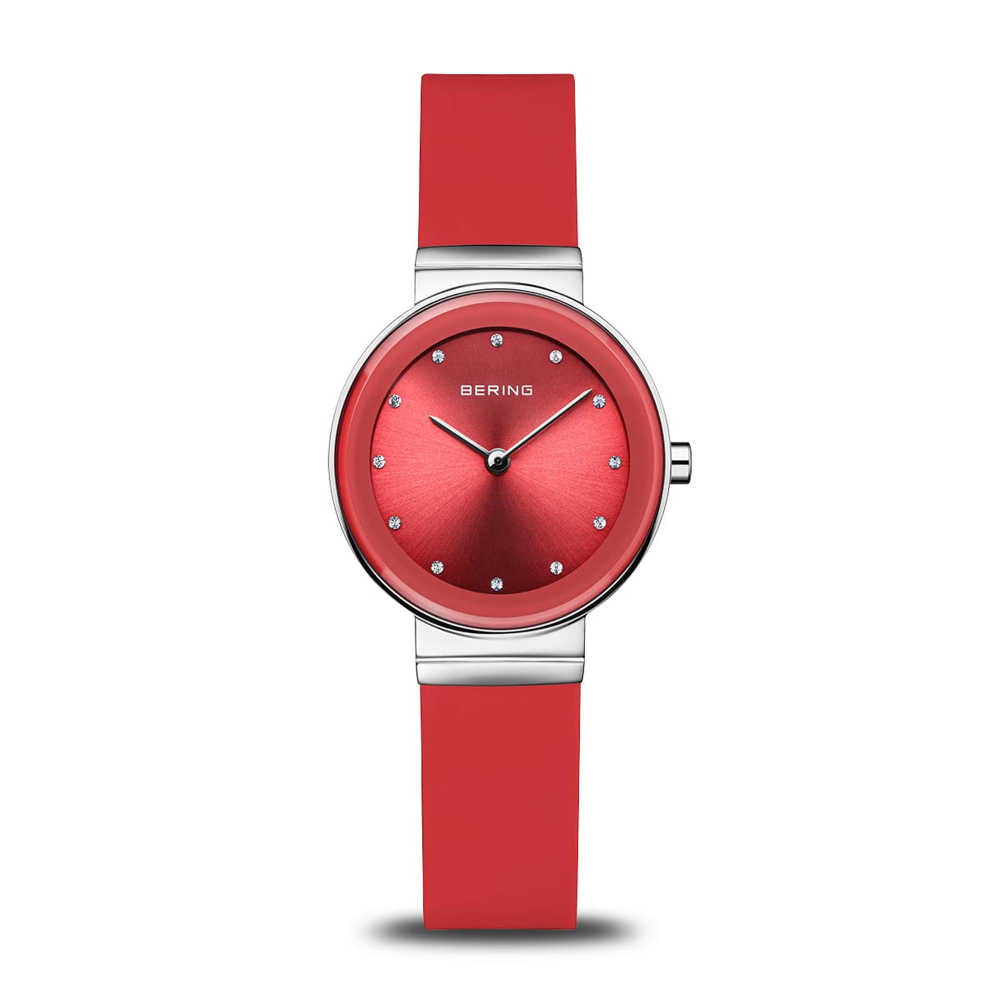 | Armband: | Silikonarmband rot, Breite: ca. 1,4 cm Länge d.Uhr: 22,5 cm Dornschließe |