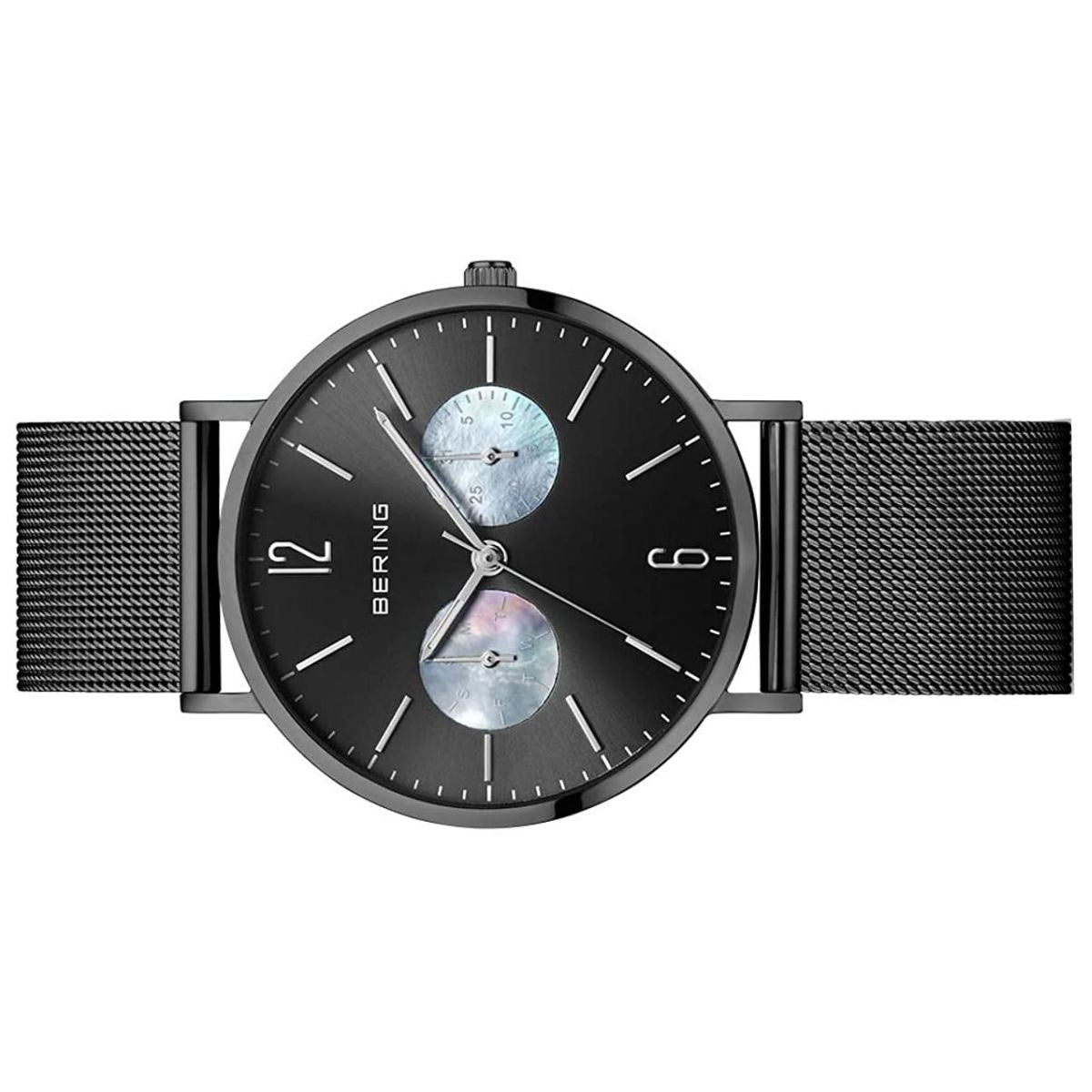 | Armband: | schwarzes Edelstahl Meshband, Breite: ca. 1,8 cm Länge d.Uhr: 21,5 cm, Druckverschluss mit Sicherheitsbügel  |