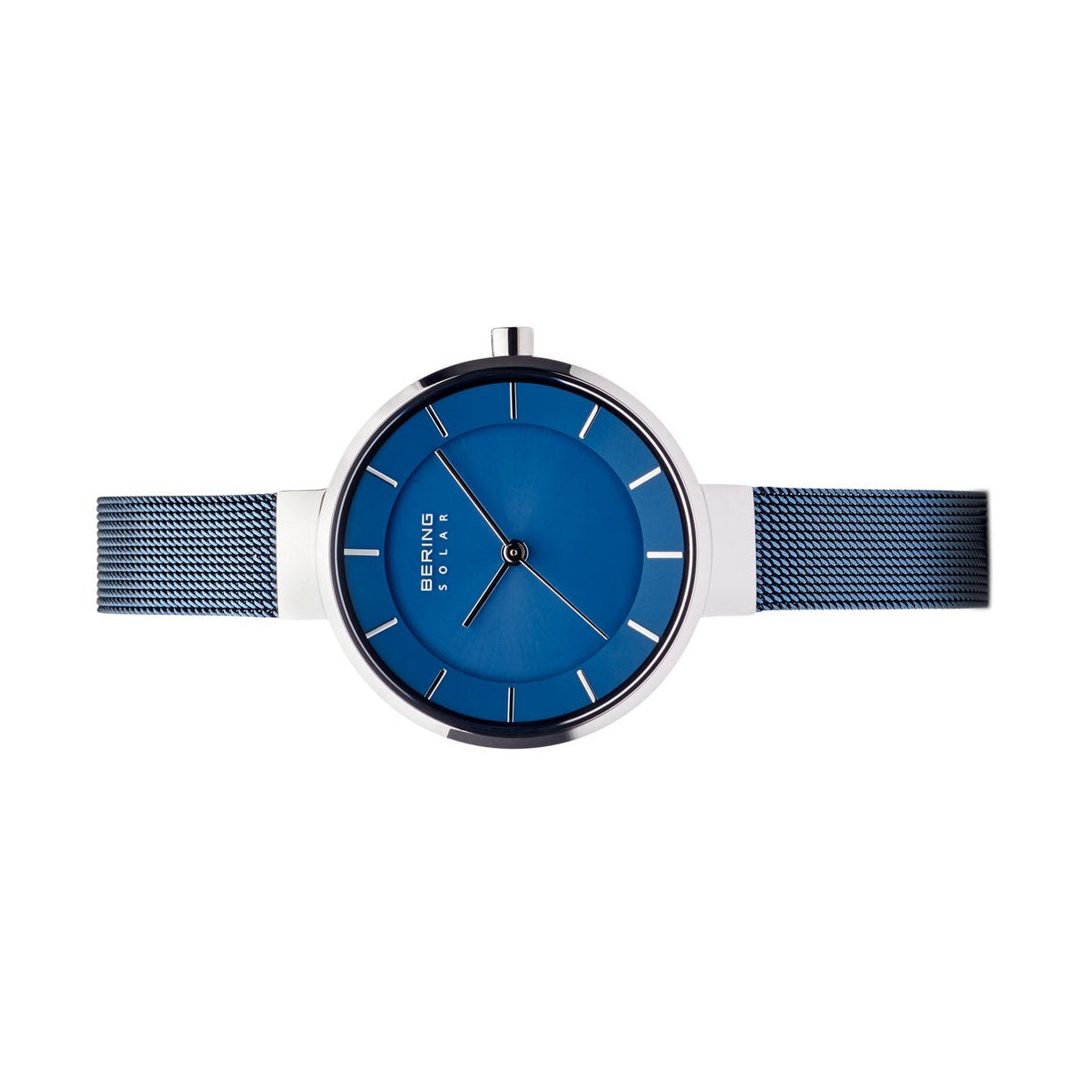 | Armband: | Blaues Edelstahl Meshband, Breite: ca. 1,0 cm Länge d.Uhr: 20,5 cm, Druckverschluss mit Sicherheitsbügel |