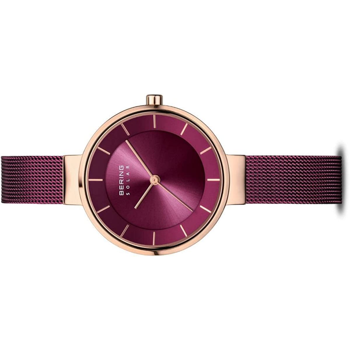 | Armband: | violettes Edelstahl Meshband, Breite: ca. 1,0 cm Länge d.Uhr: 20,5 cm, Druckverschluss mit Sicherheitsbügel |