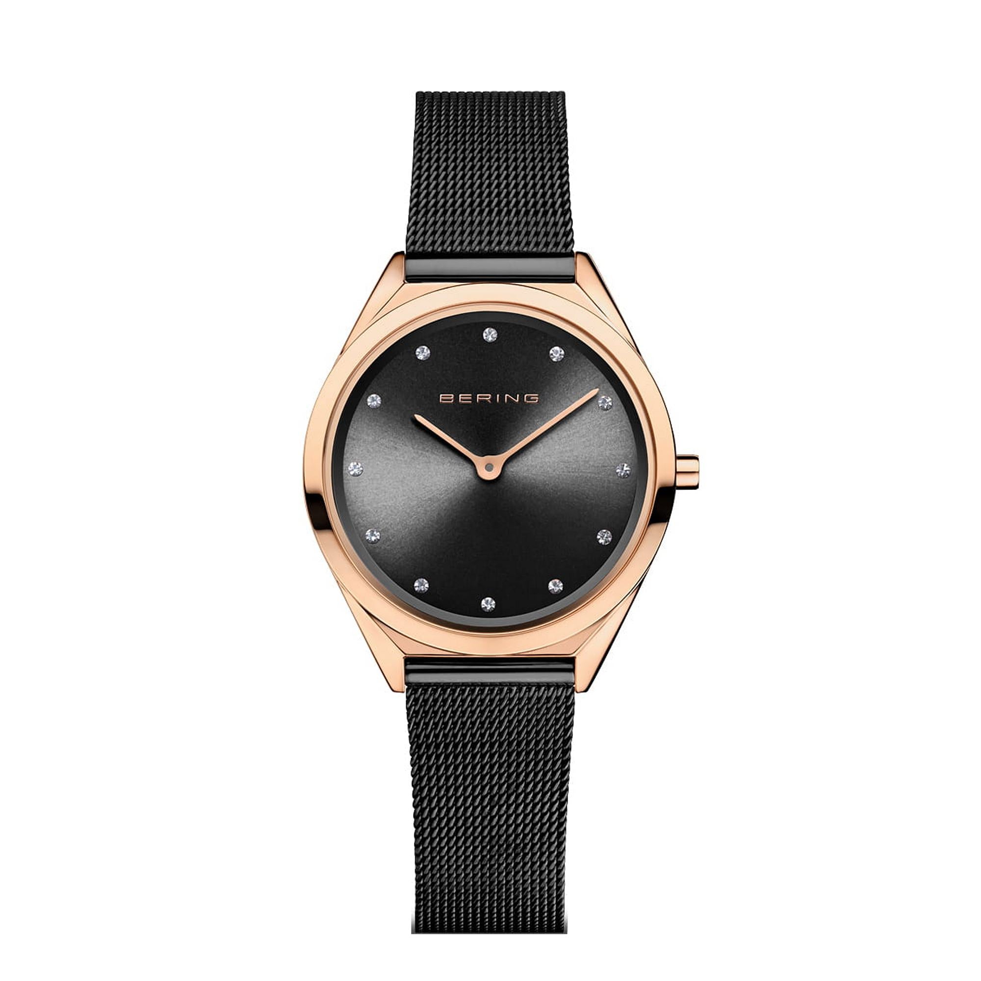 | Armband: | Edelstahlarmband schwarz, Breite: ca. 1,4 cm Länge d.Uhr: 20,5 cm, Druckverschluss mit Sicherheitsbügel |