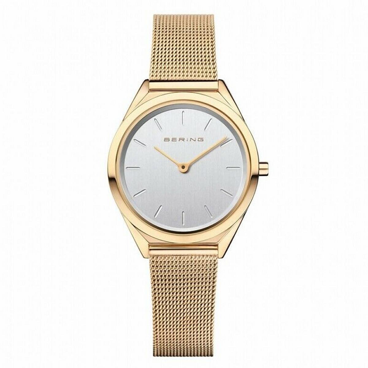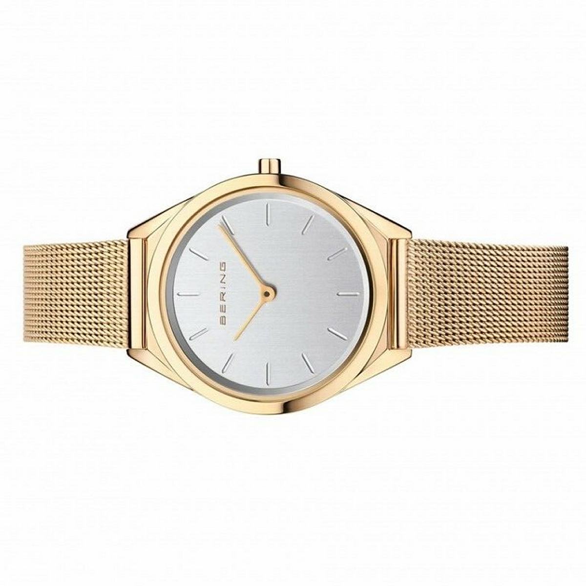 | Armband: | Edelstahlarmband goldfarben, Breite: ca. 1,4 cm Länge d.Uhr: 20,5 cm, Druckverschluss mit Sicherheitsbügel |