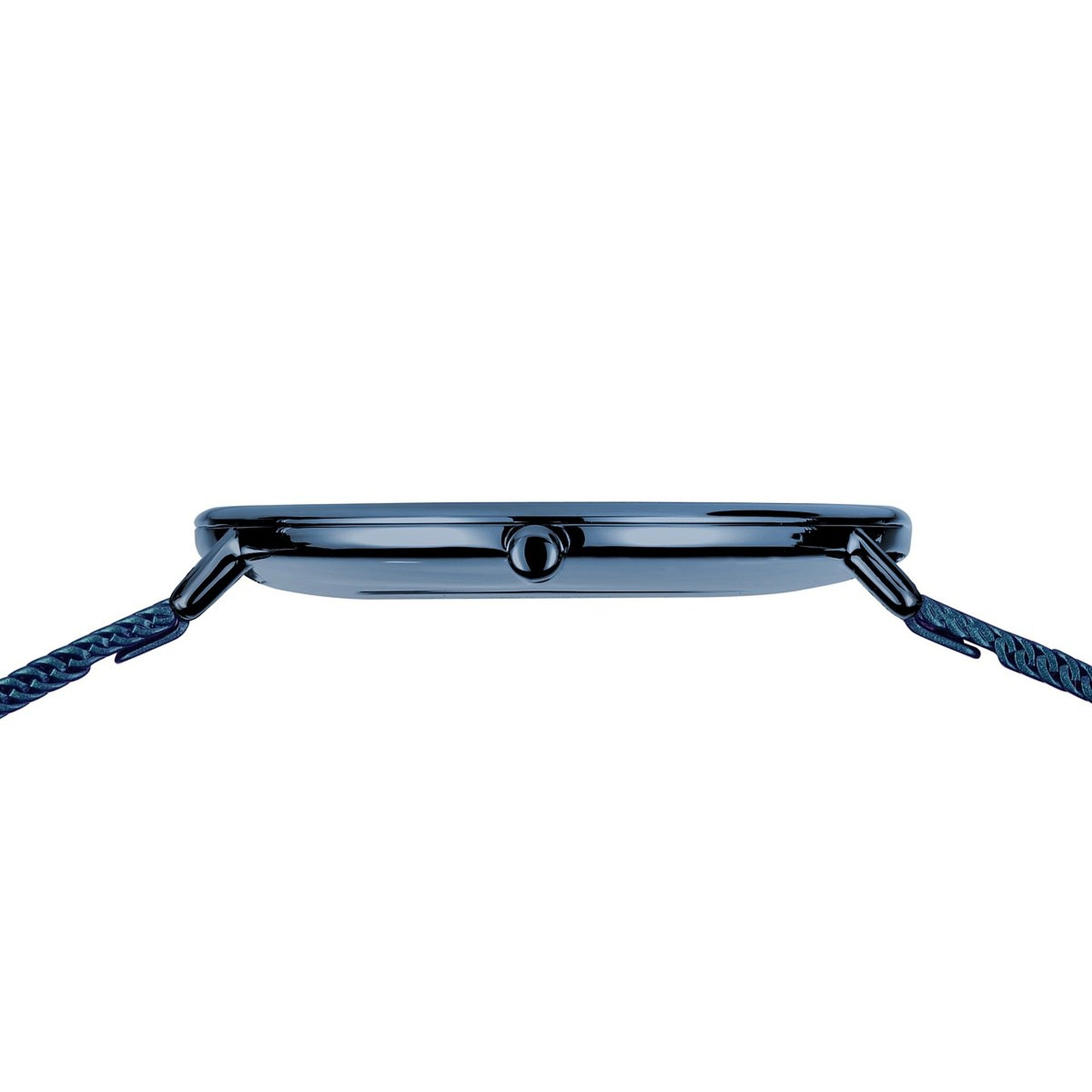 | Armband: | Edelstahlarmband -Milanaiseband blau, Breite: ca. 1,4 cm, Länge d.Uhr: 21,5 cm, Druckverschluss mit Sicherheitsbügel |