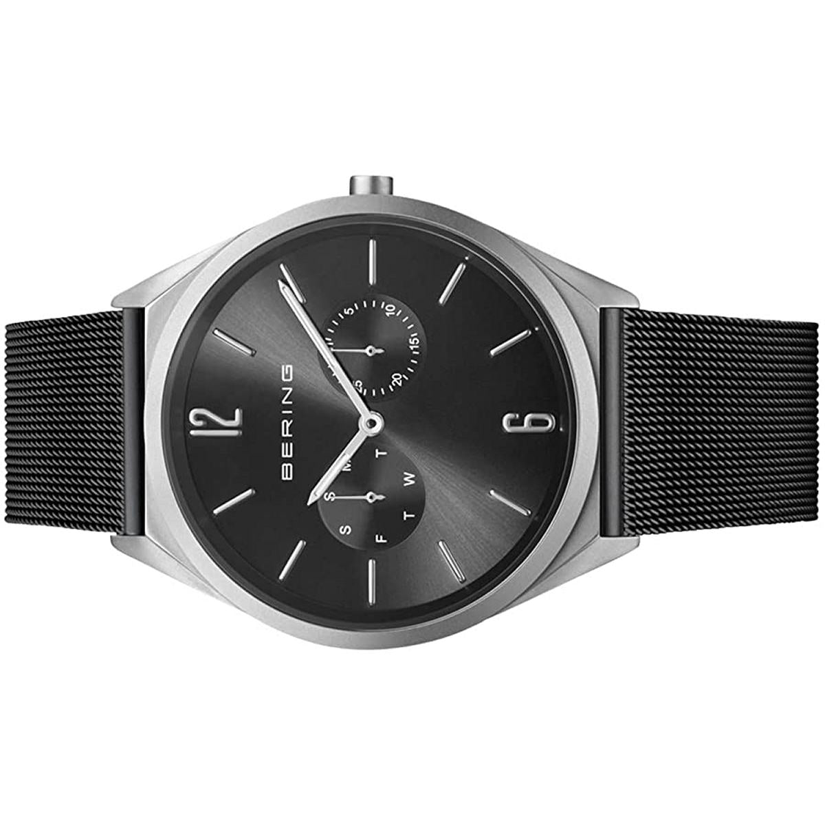 | Armband: | Edelstahlarmband schwarz IP in Mesh Optik, Breite: ca. 1,8 - 1,9 cm Länge d.Uhr: 22,5 cm, Druckverschluss mit Sicherheitsbügel |