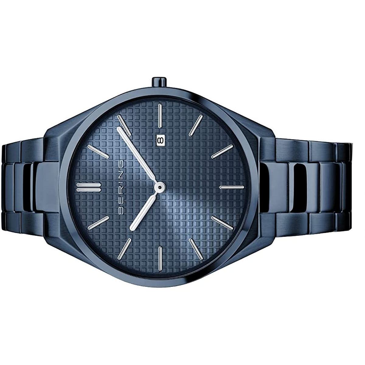 | Armband: | Edelstahlarmband blau, Breite: ca. 2,0 cm Länge d.Uhr: 22,5 cm, Druckverschluss mit Sicherheitsbügel |