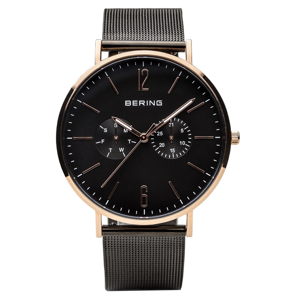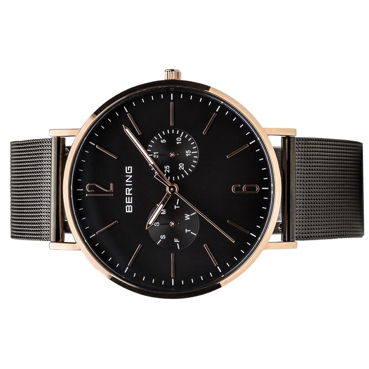 | Armband: | Edelstahlarmband schwarz in Mesh Optik, Breite: ca. 2,0 cm Länge d.Uhr: 22,5 cm, Druckverschluss mit Sicherheitsbügel |