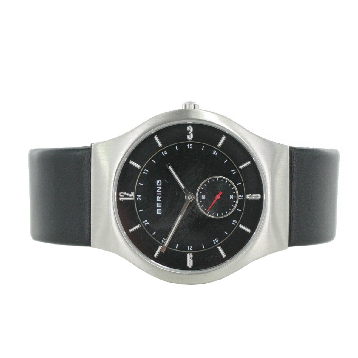 | Armband: | Lederband schwarz, Breite: ca. 2,2 cm Länge d.Uhr: 23,5 cm, Dornschließe |