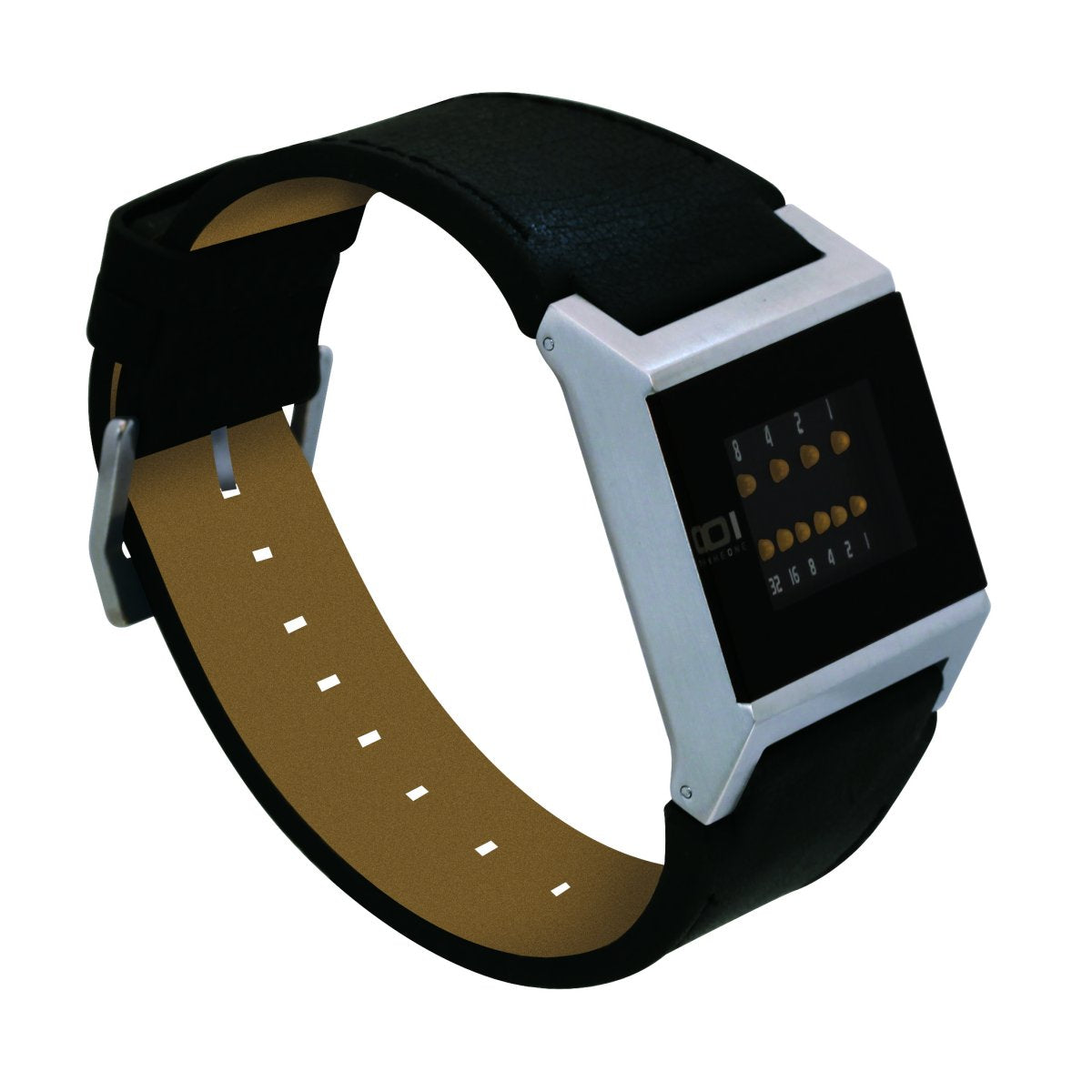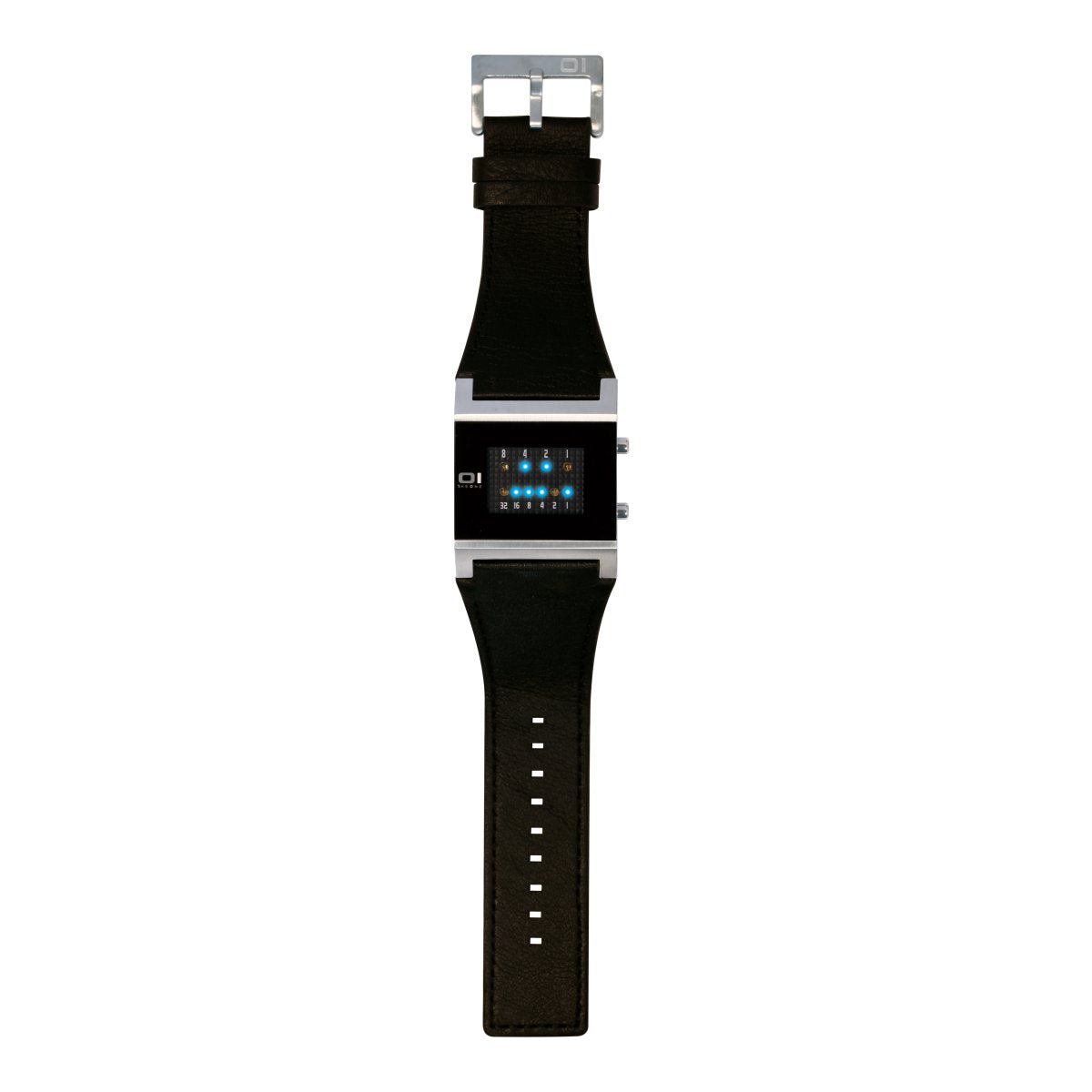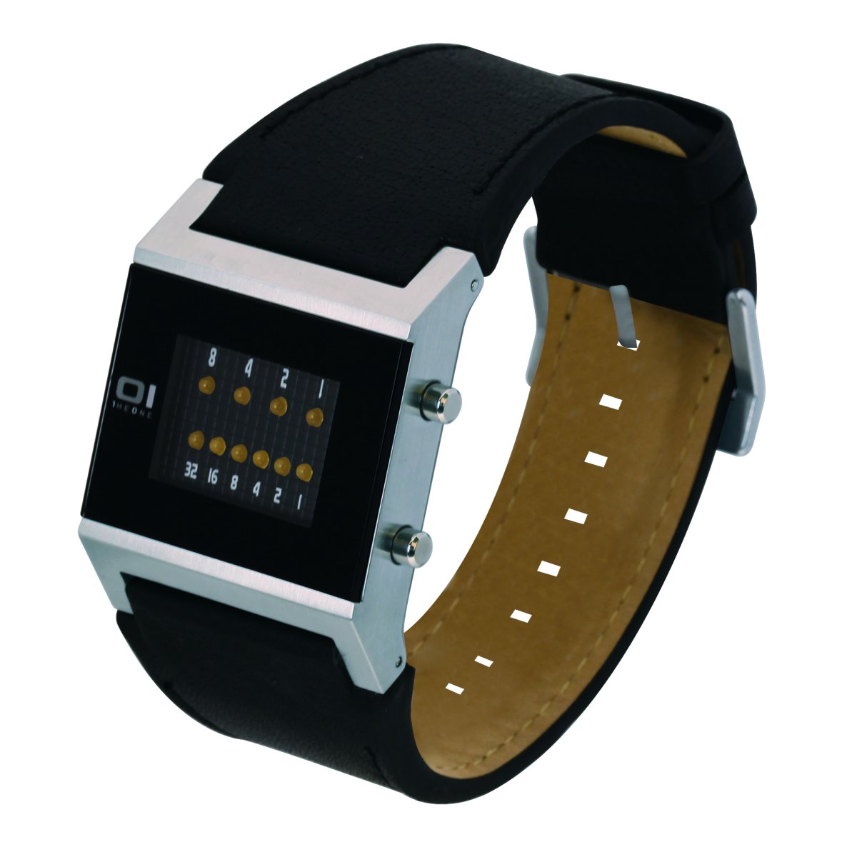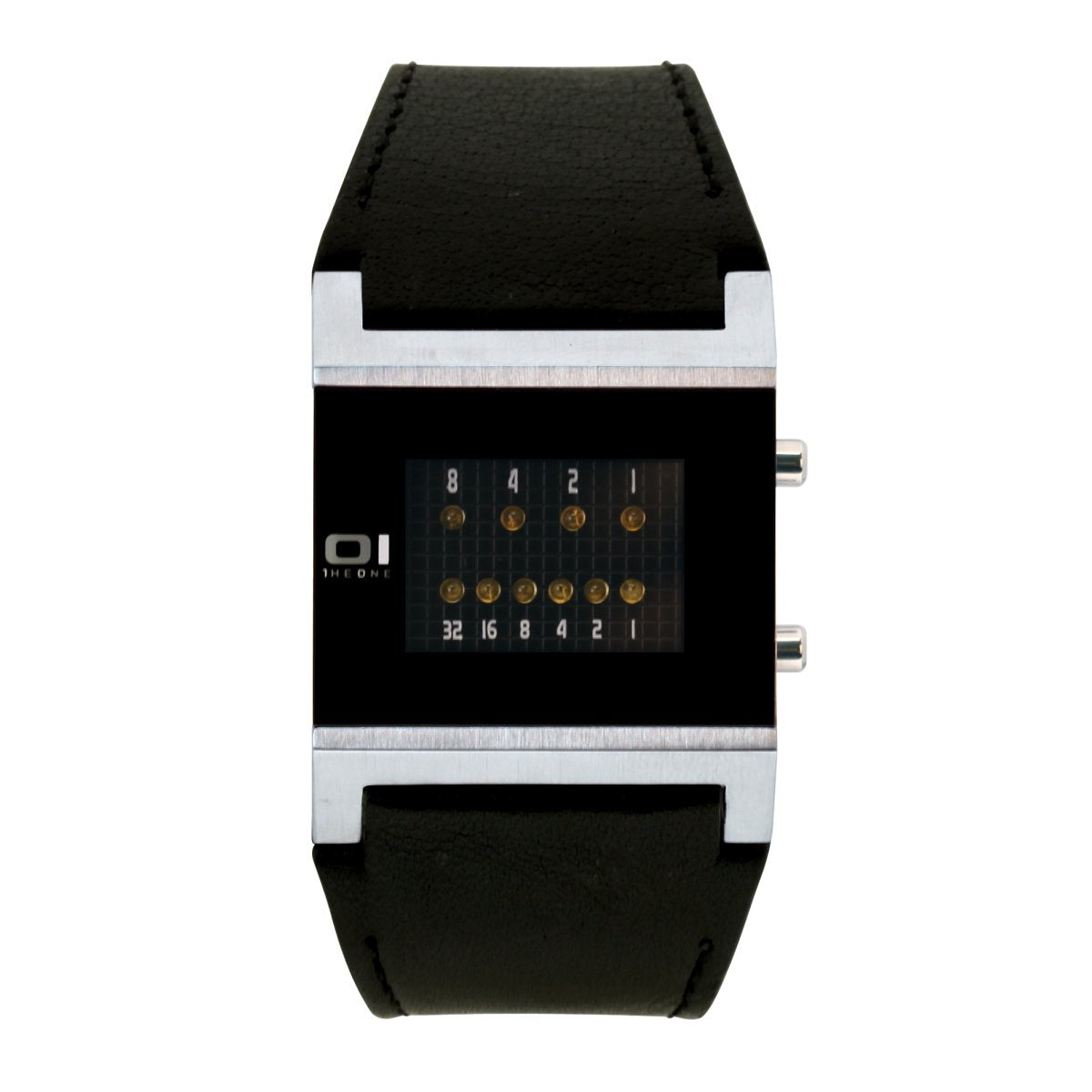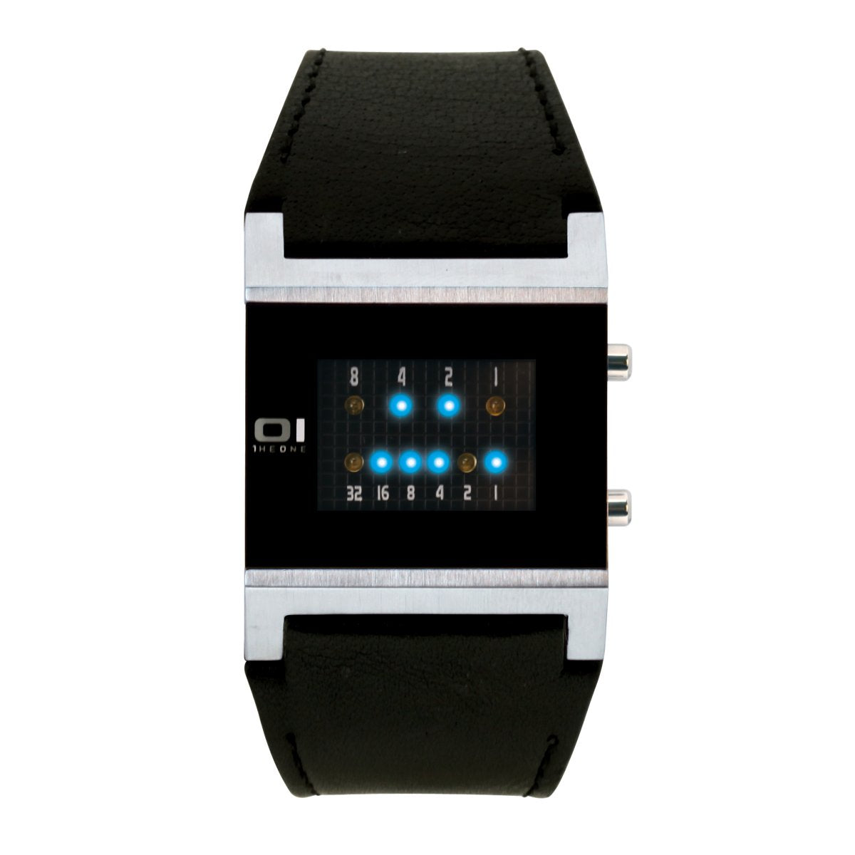 | Funktionen / Anzeigen: | Quarzwerk, Mineralglas, Datum und Uhrzeit Anzeige im Binärmodus. THE ONE Binary Uhren sind Armbanduhren mit LED Zeitmessung. Die Anzeige der Uhrzeit erfolgt im Binärformat mit Hilfe von LED Lichtern. Zwei Reihen von Dioden leuchten in unterschiedlichen Kombinationen.Die LEDs der oberen Reihe stehen für Stunden mit den Werten (8-4-2-1). Die LEDs der unteren Reihe stehen für Minuten (32-16-8-4-2-1). Jede Uhrzeit ist hiermit ablesbar - und das völlig ohne Zeiger. Funktionelle Bedienung der Uhr über zwei Knöpfe. Bei Knopfdruck wird die Uhrzeit für 5 Sekunden angezeigt. |