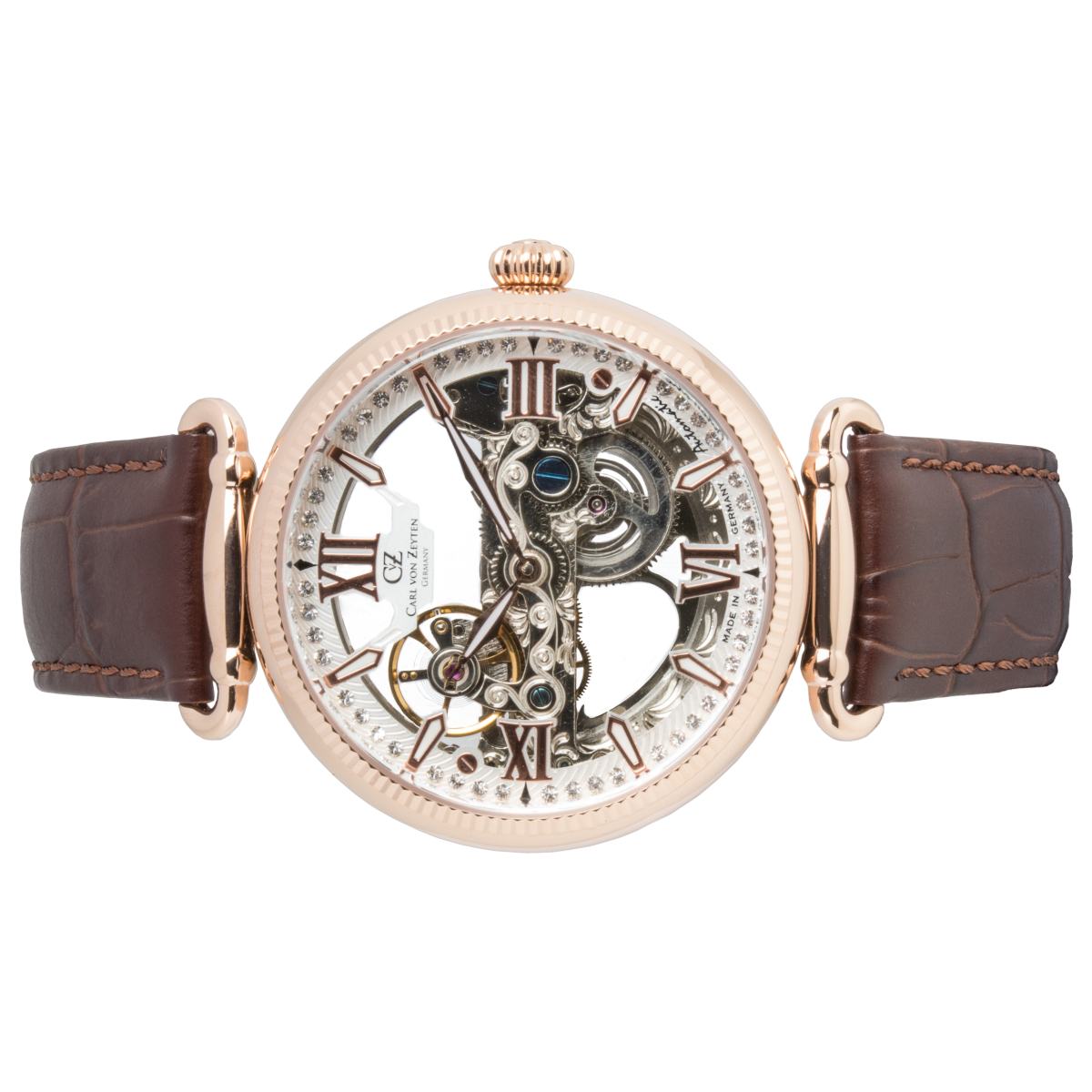 | Zifferblatt: | Analog, Farbe: silber mit Steinchen besetzt (skelettiertes Zifferblatt) |
