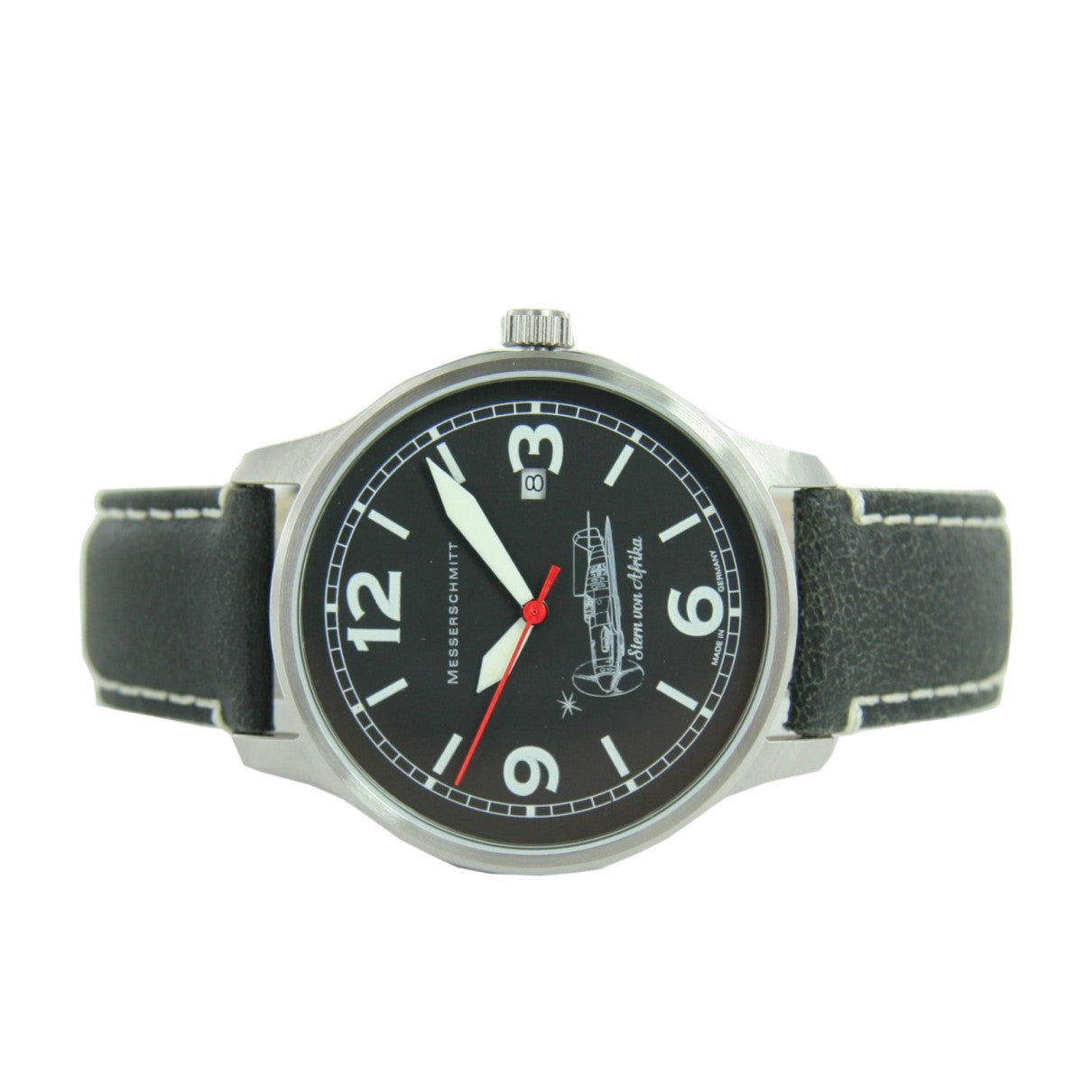 | Armband: | schwarz meliertes Lederarmband mit Ziernaht, Dornschließe Breite: ca. 20 mm Länge d. Uhr: ca. 23 cm |