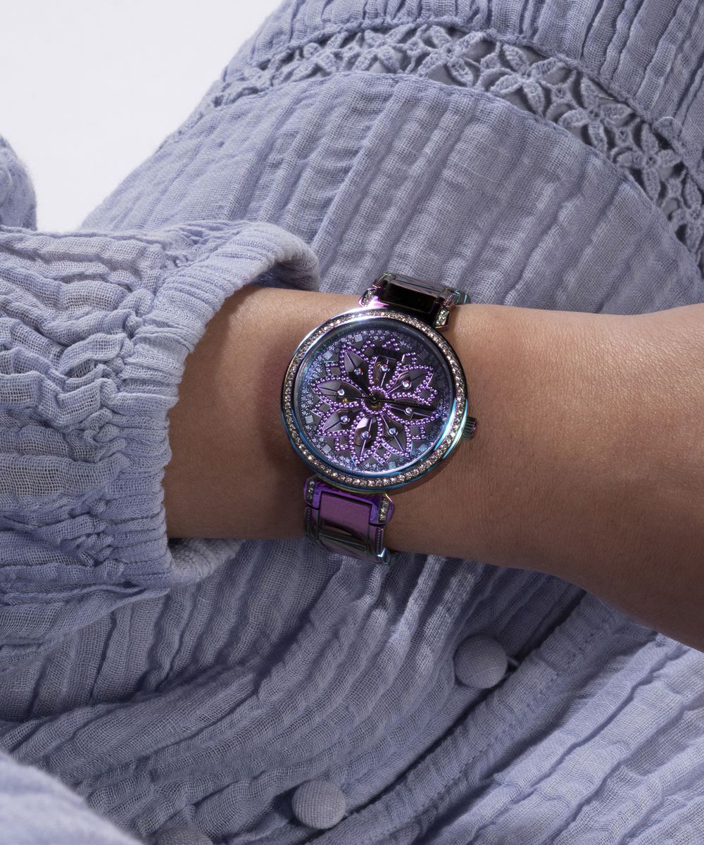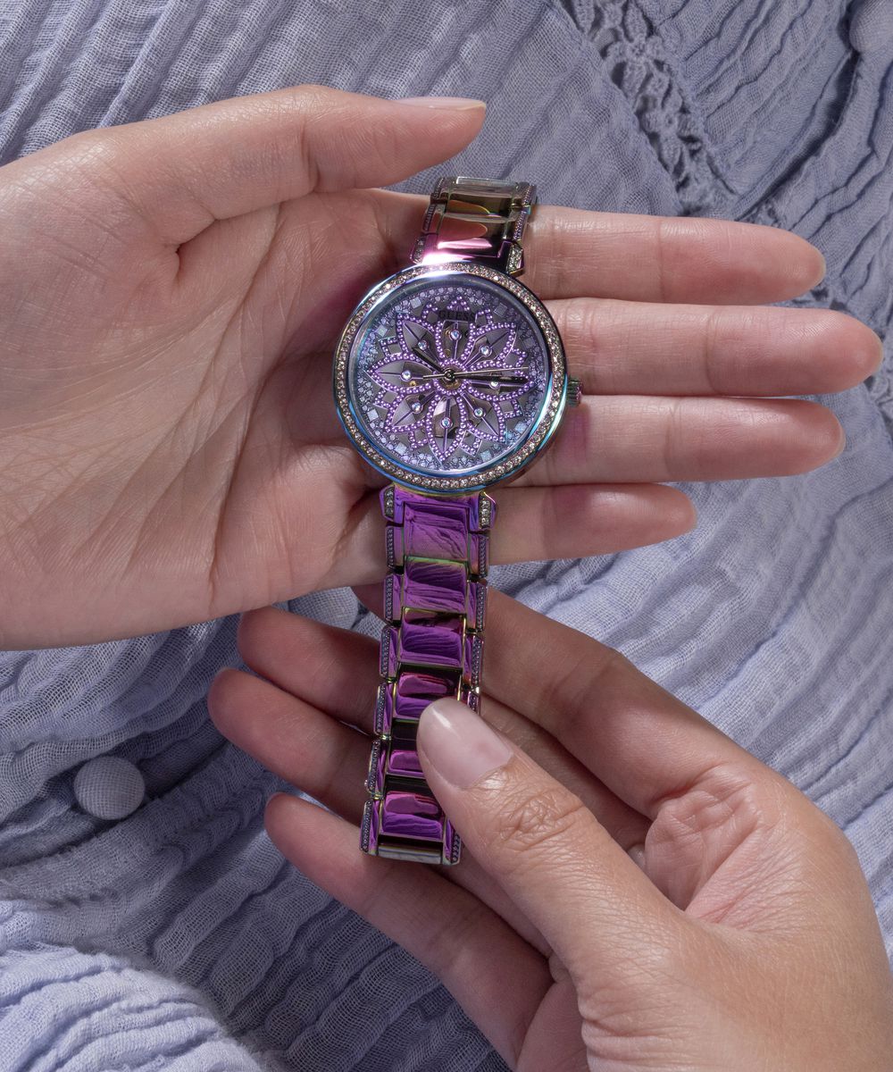| Gehäuse: | Edelstahlgehäuse Irisierend - Regenbogenfarben , Lünette mit Steinchen Durchmesser ca. 36,0 mm (ohne Krone), Höhe ca. 9250 mm |