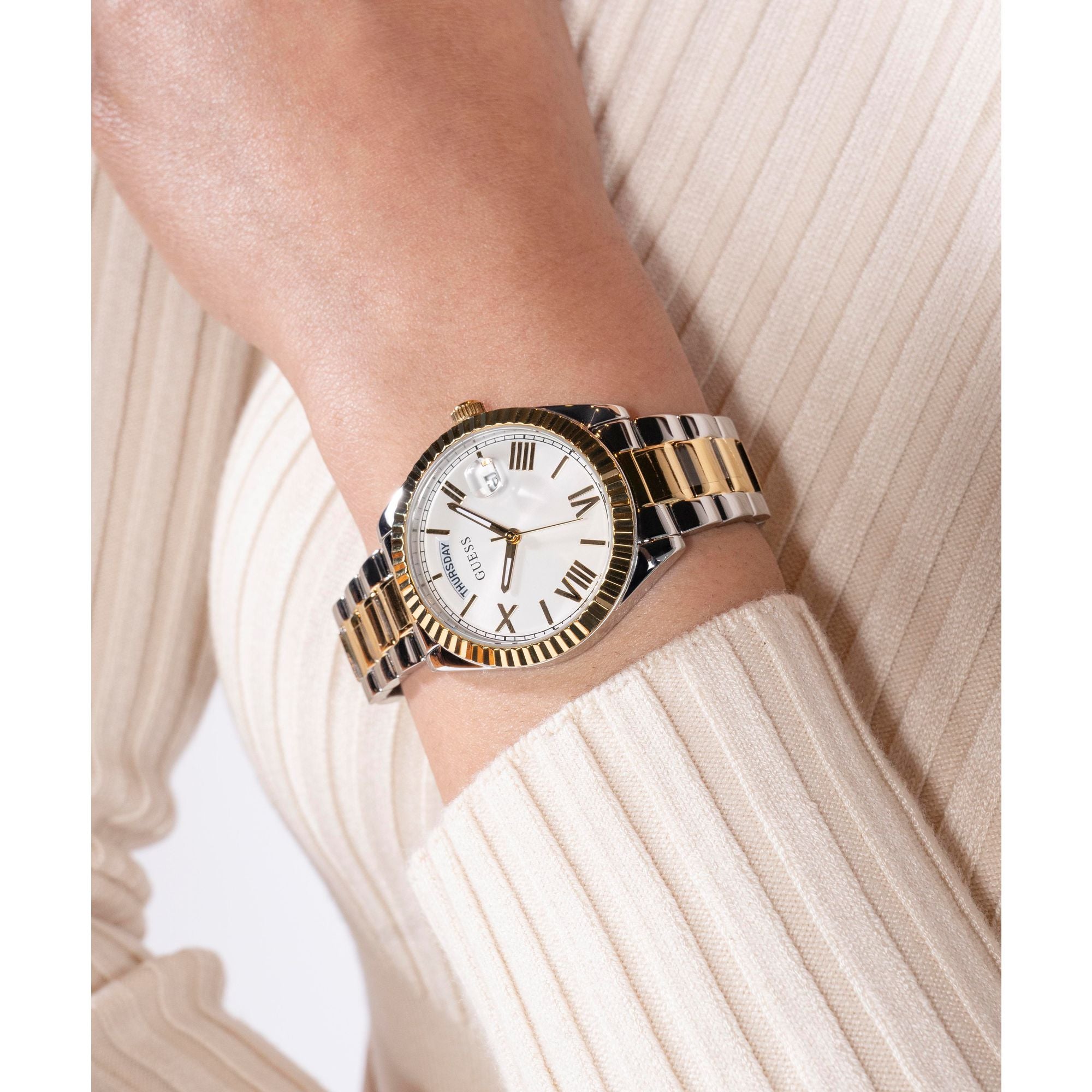 | Armband: | Edelstahlarmband bicolor, Breite: ca. 1,8 cm Länge der Uhr: ca. 19,0 cm Faltschließe |