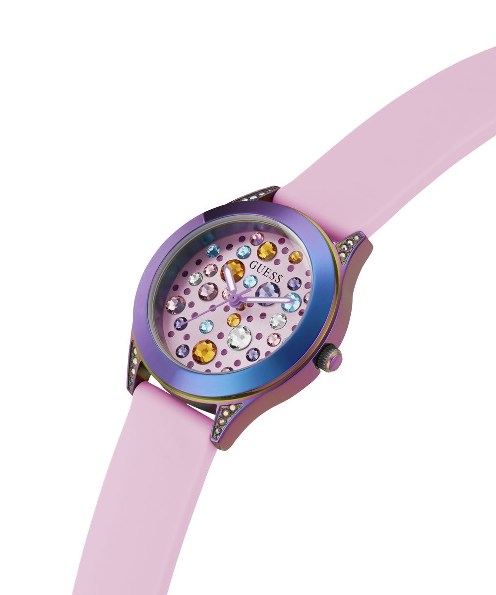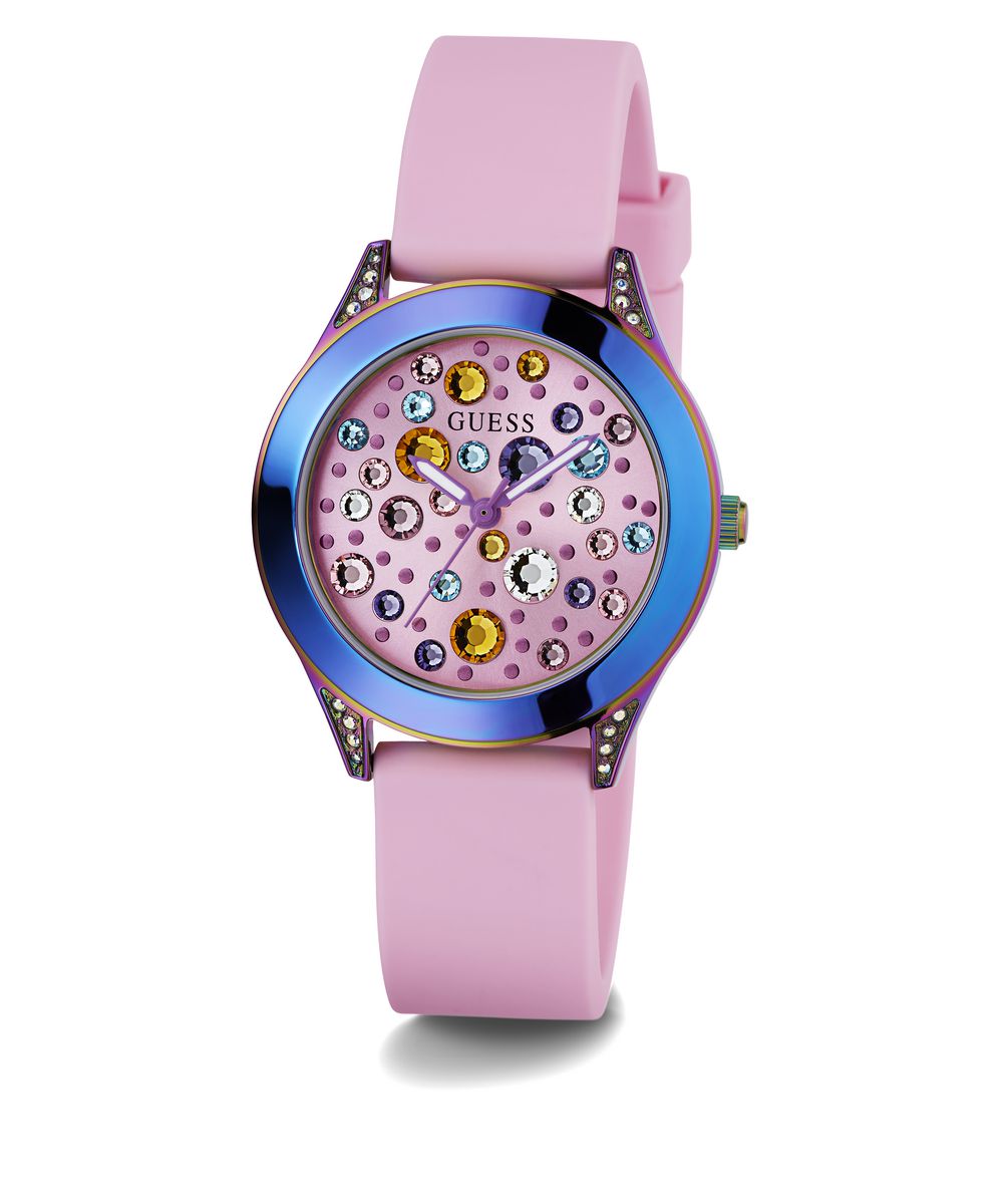 | Zifferblatt: | analog, Farbe: pink mit bunten Steinchen |