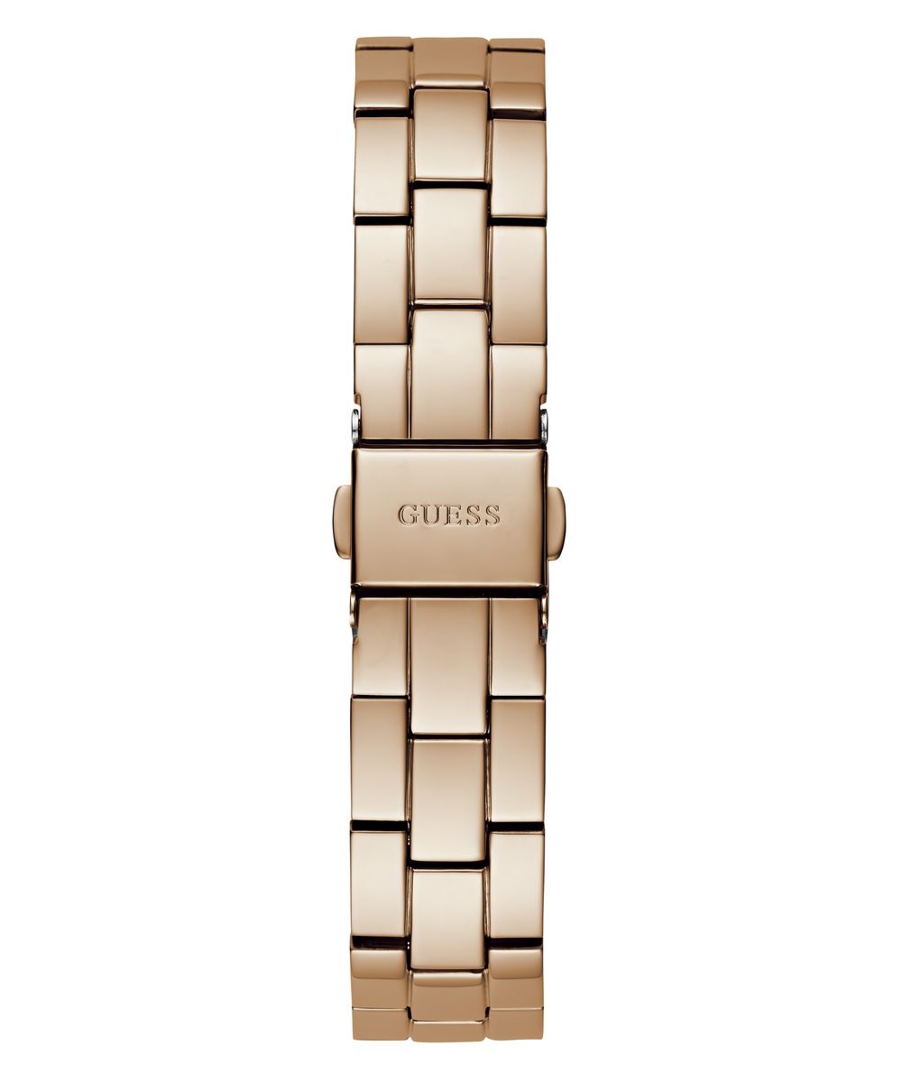 | Armband: | Edelstahlarmband roségoldfarben mit Steinen besetzt, Breite: ca. 1,4 cm Länge der Uhr: ca. 19,0 cm Faltschließe |