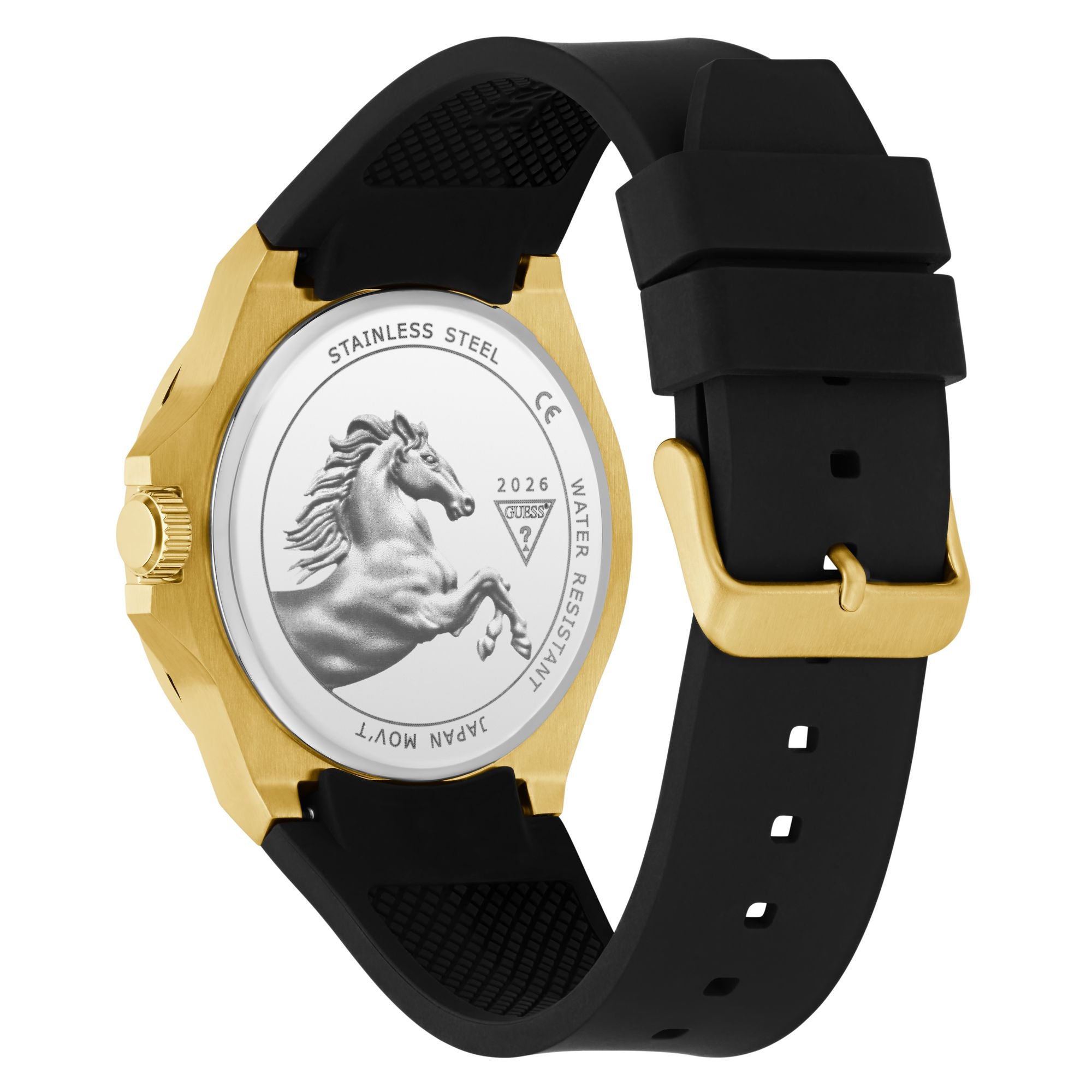 | Armband: | schwarzes Silikonarmband, Breite: ca. 2,6 cm Länge der Uhr: ca. 23,0 cm, Dornschließe |