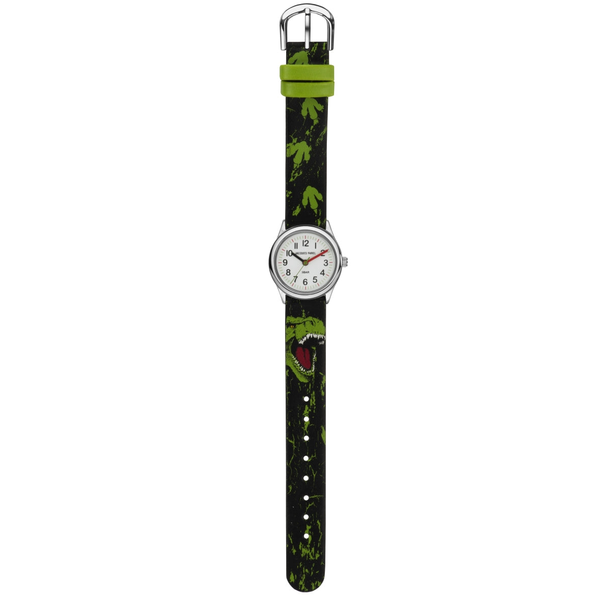 Diese Kinderuhr der Marke JACQUES FAREL überzeugt durch ihr Dino-Motiv auf dem veganen Leatherette-Armband. Das polierte, glänzende Metallgehäuse bietet einen tollen Kontrast zum Band, welches leicht schimmert. Der Gehäuseboden und die Krone sind aus Edelstahl und sehr angenehm auf der Haut zu tragen. Mit 3 bar Wasserdichtigkeit ist die Uhr auch vor Spritzern geschützt. |