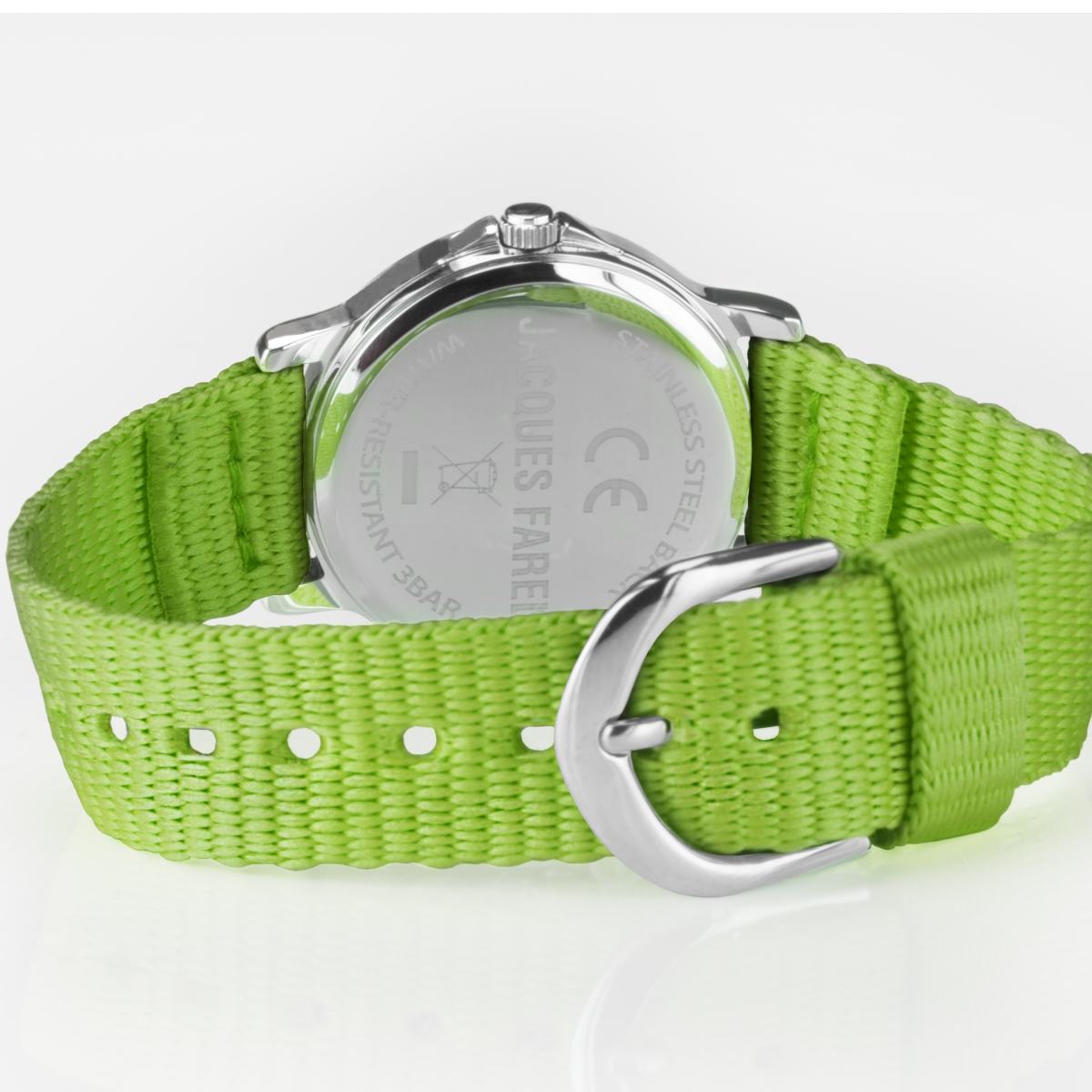 Die JACQUES FAREL Armbanduhr KCF 090 ist weit mehr als ein Kinderuhr-Klassiker: sie ist sowohl als Lernuhr für den Anfang geeignet als auch als schönes Accessoire ohne viel "Schnickschnack“ - die besten Voraussetzungen für eine Lieblingsuhr! Das silberfarbene Gehäuse aus Metall hat einen Durchmesser von 29 mm und ist 9 mm hoch. Die Uhr ist mit einem Mineralglas und 3 bar Wasserdichtigkeit auch gut vor Spritzwasser geschützt. Der Gehäuseboden, Krone und Bandschließe sind aus hautverträglichem Edelstahl gefertigt. Das schlichte Zifferblatt mit großen deutlichen Zahlen, farbigen Zeigern und 24h-Beschriftung lässt sich sehr gut ablesen. Das Nylonband ist robust genug, um dem Alltag Stand zu halten und gleichzeitig angenehm weich auf der Haut zu tragen. Das Armband ist 14 mm breit und für einen Armumfang von 12 bis 17,5 cm geeignet. Ein schönes Accessoire für Mädchen und Jungen und ideal als Geschenk für viele Anlässe. |