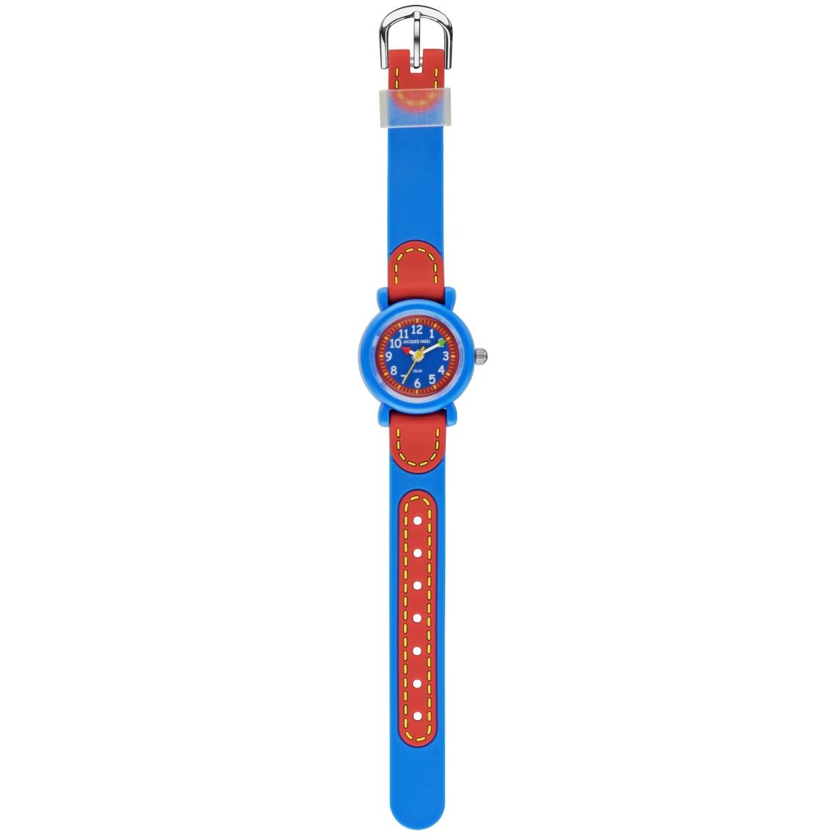 Armband: | Silikonband blau / rot Breite: ca. 1,2 cm Länge d.Uhr: ca. 17,5 cm, Dornschließe |