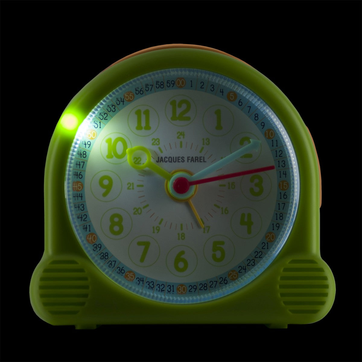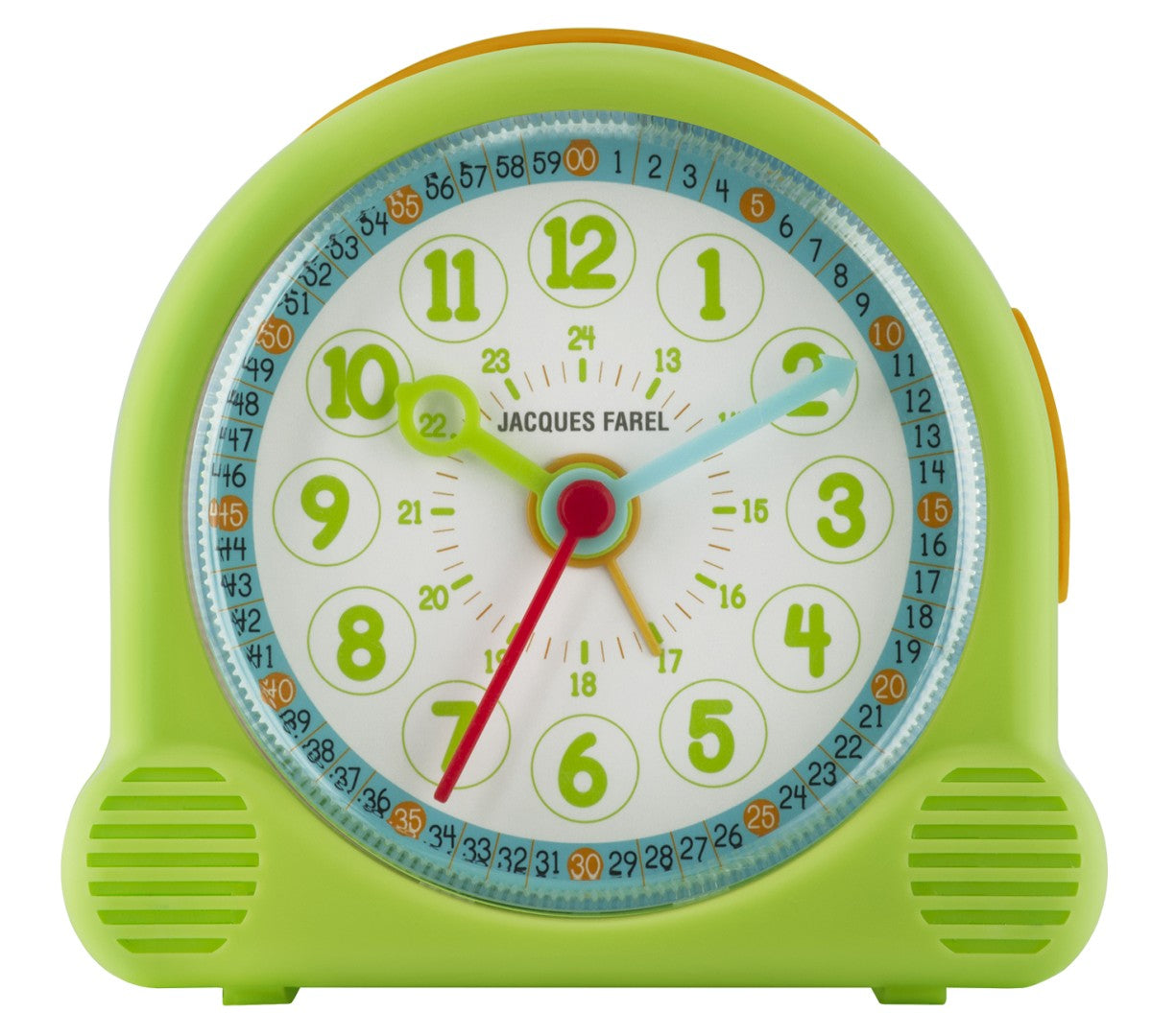 Der Happy Learning Wecker von JACQUES FAREL bietet Kindern durch die logische Gestaltung des übersichtlichen Zifferblattes und der Zeiger, die ideale Voraussetzung, um die Uhrzeit einfach zu lernen. Die Farbe Grün steht für die Stunde. Der Stundenzeiger ist grün und zeigt auf die gleichfarbigen großen Ziffern eins bis zwölf. Durch die Aussparung im Stundenzeiger erkennt das Kind die 24-Stundeneinteilung. Der extra lange hellblaue Minutenzeiger zeigt exakt auf die einzelnen Minuten im gleichfarbigen Minutenring. Orange sind alle Alarmelemente wie der Einstellzeiger, die Weckskala mit der ¼-Stunden Einteilung, der Ein- und Ausschalter und der Snoozeknopf. Durch seine abgerundete Form, grifffeste Einstellknöpfe und seiner Standsicherheit ist der JACQUES FAREL Wecker der ideale Wecker für kleine Uhrzeit-Anfänger; super geeignet als Geschenk zur Einschulung oder Geburtstag. |
