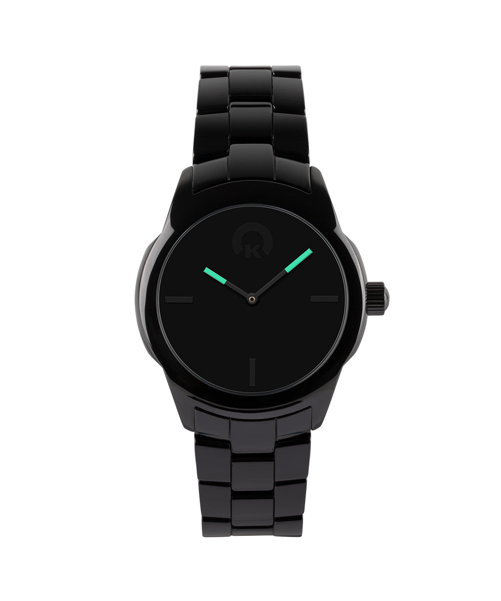 Statement-Uhr in nachtdunklem Schwarz mit auffallendem, farblichem Akzent: Gehäuse, Krone und Armband in schwarzer, glänzender Keramik, schwarzes Ziffernblatt mit dezentem Kraftworxs Logo und Uhrzeigern in der Trend-Schmuckfarbe Mint.