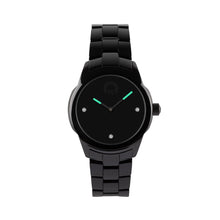 Statement-Uhr in nachtdunklem Schwarz mit farblichem Akzent: Gehäuse, Krone und Armband in schwarzer, glänzender Keramik, schwarzes Ziffernblatt mit dezentem Kraftworxs Logo und funkelnden Kristallen, Uhrzeiger in der Trendfarbe Mint.