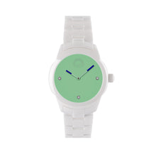 Damenuhr Full Moon: Gehäuse, Krone und Armband aus weißer Keramik, Ziffernblatt Mint mit Kraftworxs Logo und funkelnden Kristallen, Zeiger in kontrastierendem Mint.