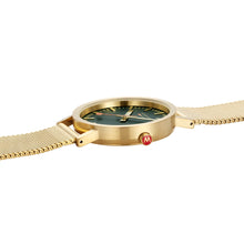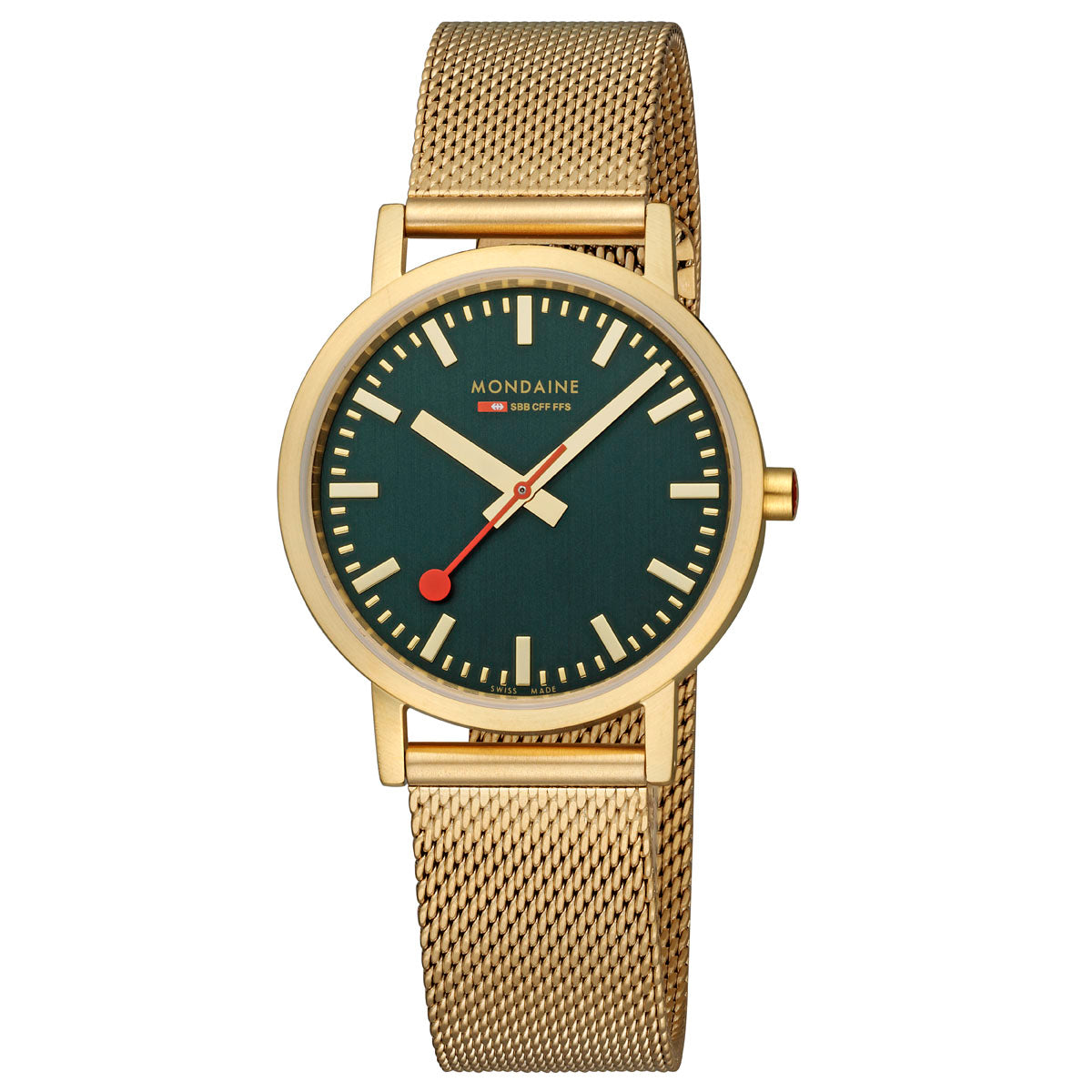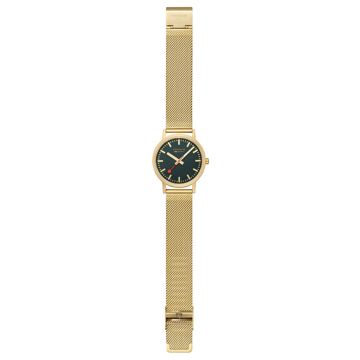 | Armband: | Edelstahlarmband goldfarben, Faltschließe und Mondaine-Logo |
