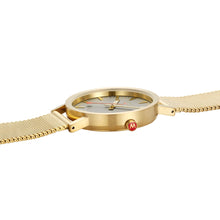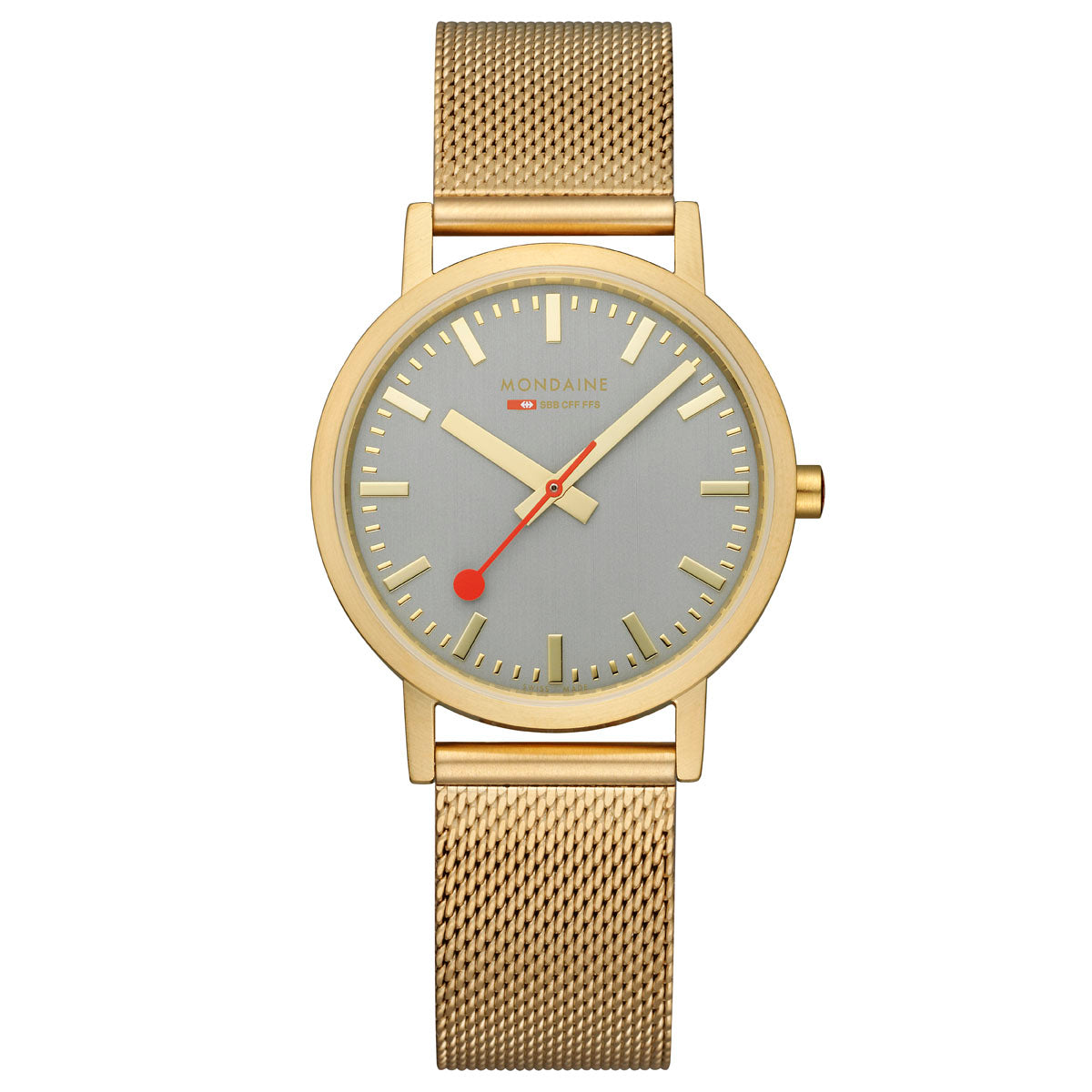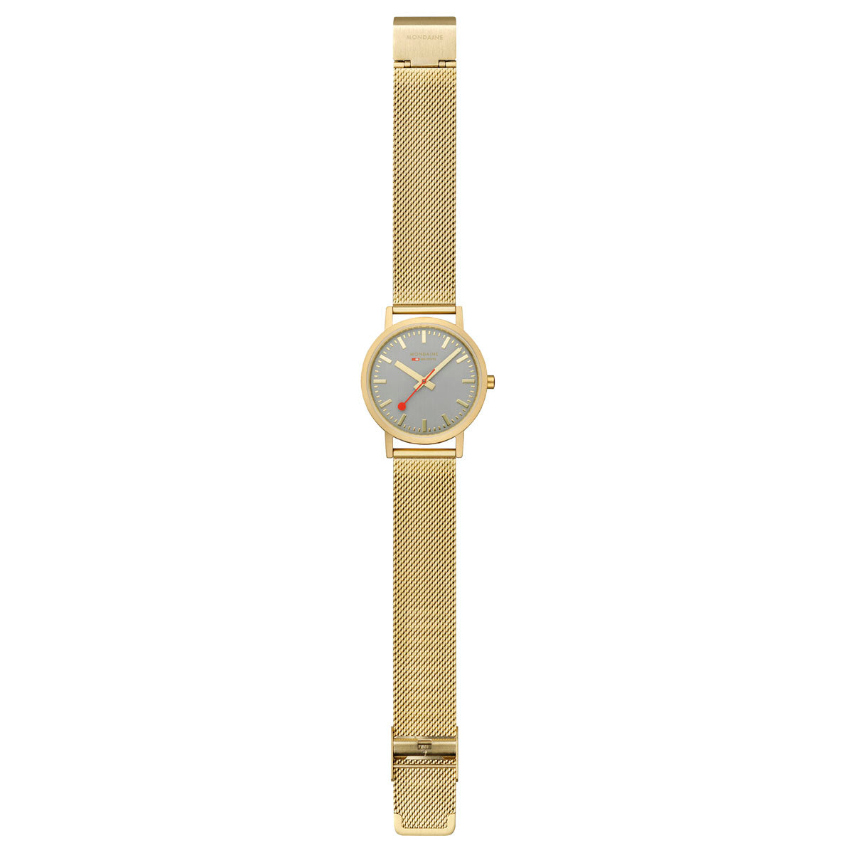 | Armband: | Edelstahlarmband (Mesh) goldfarben, Faltschließe und Mondaine-Logo |