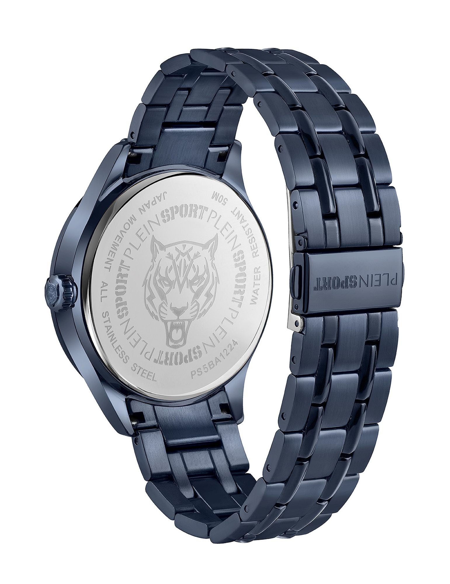 | Gehäuse: | Edelstahlgehäuse IP Blue, Lünette blau, Durchmesser : ca. 4,5 cm, Stärke: ca. 1,1 cm, Gewicht: ca. 160 Gramm |