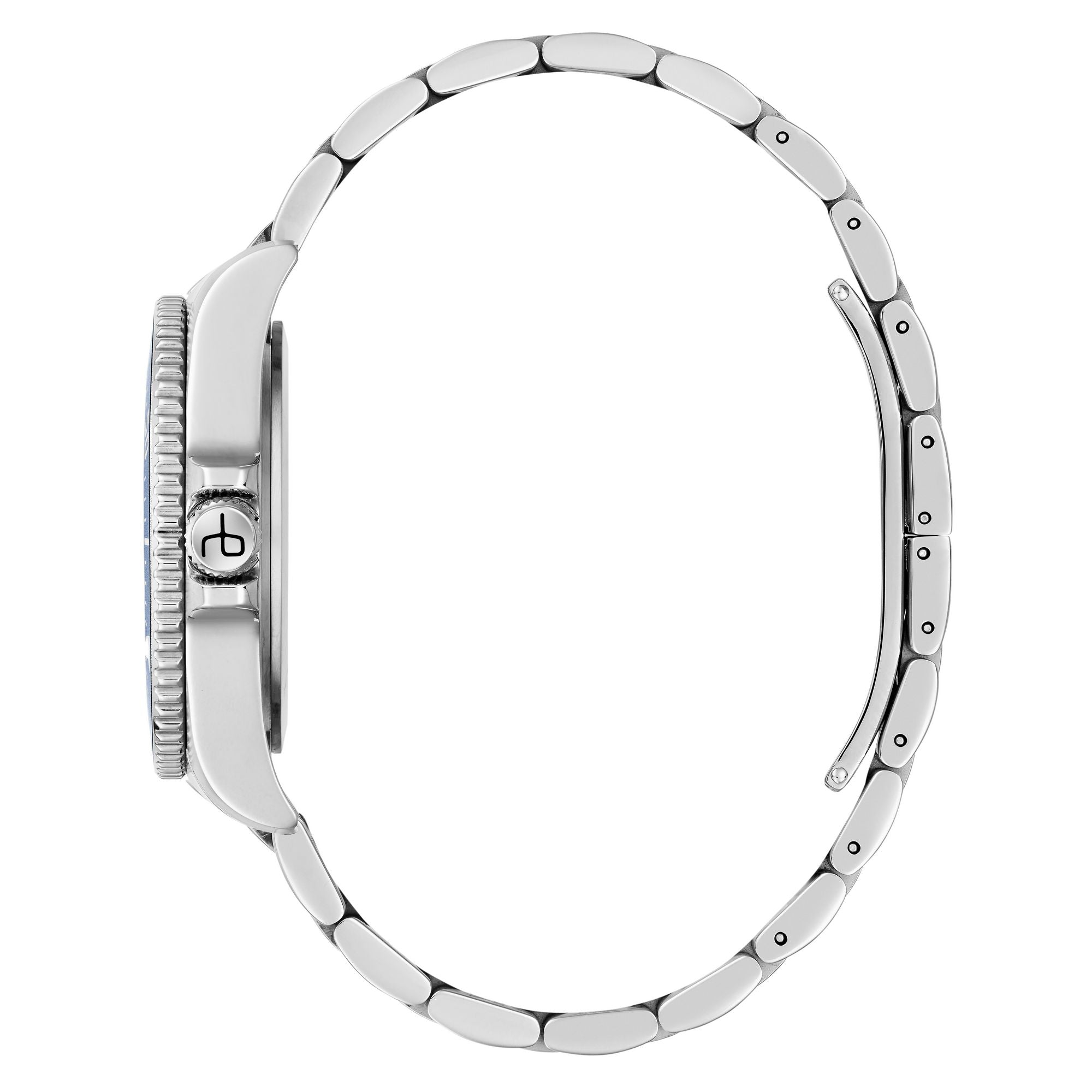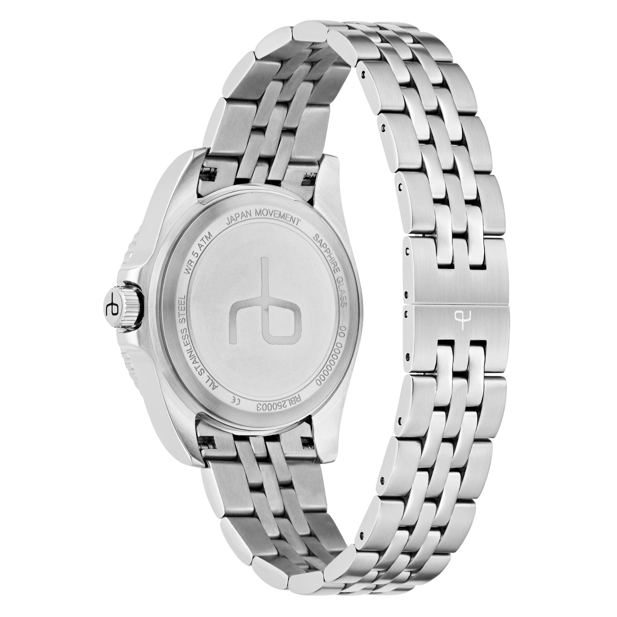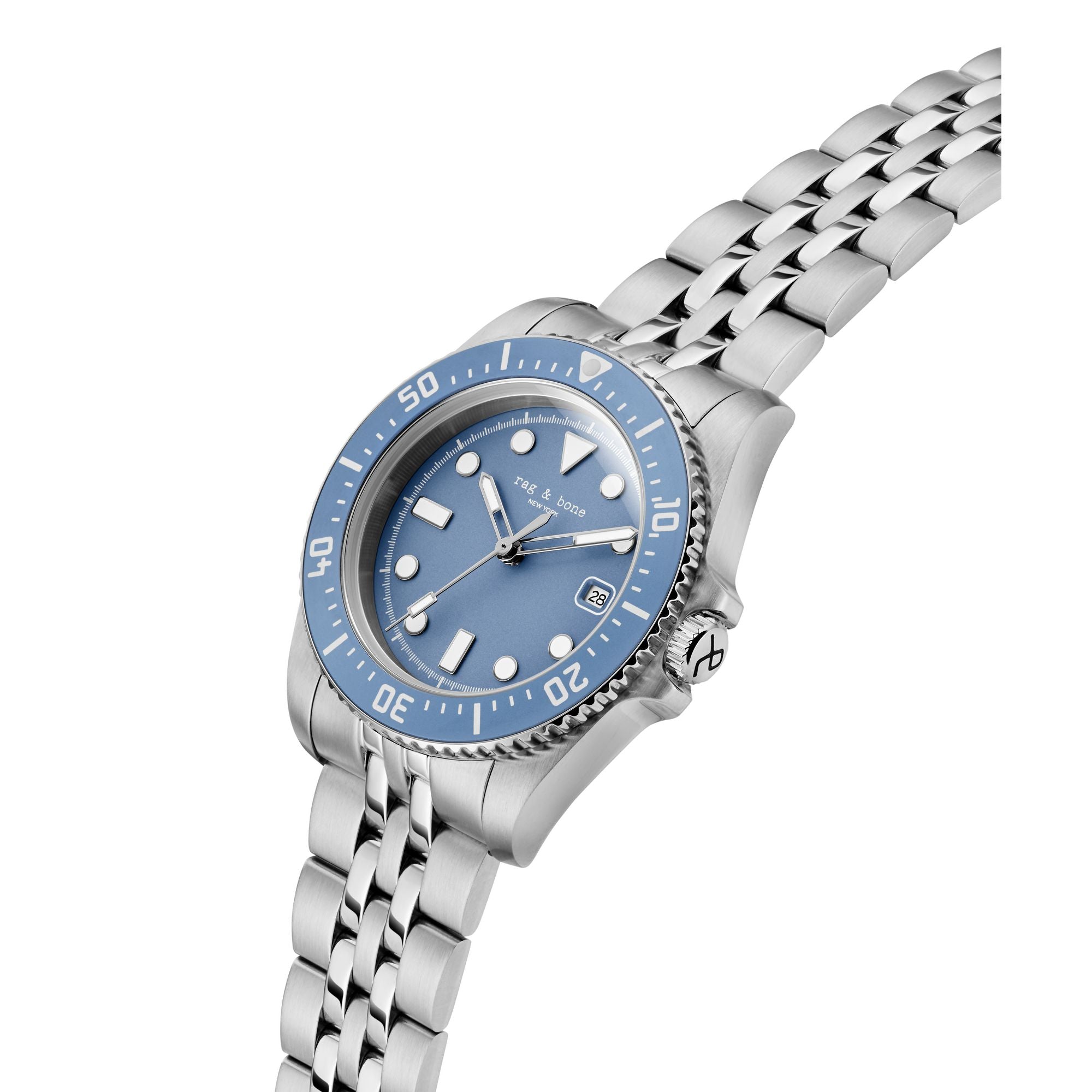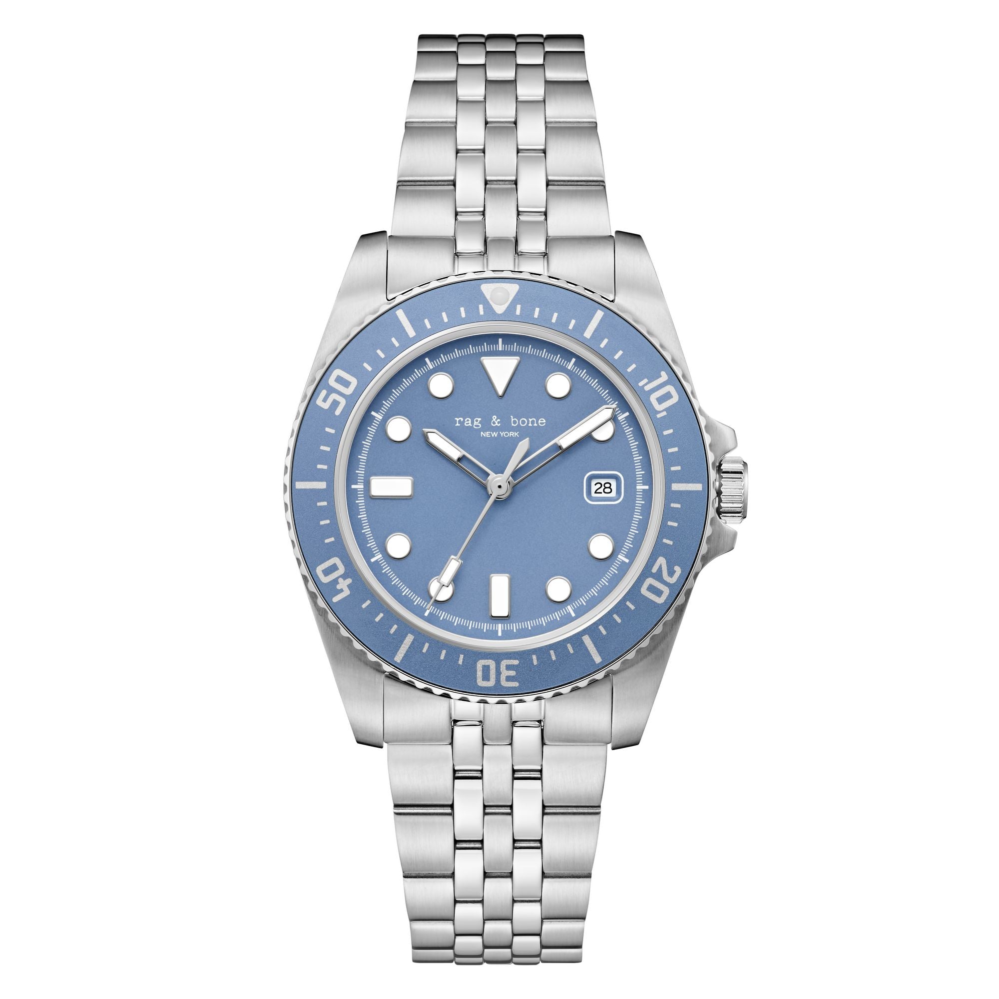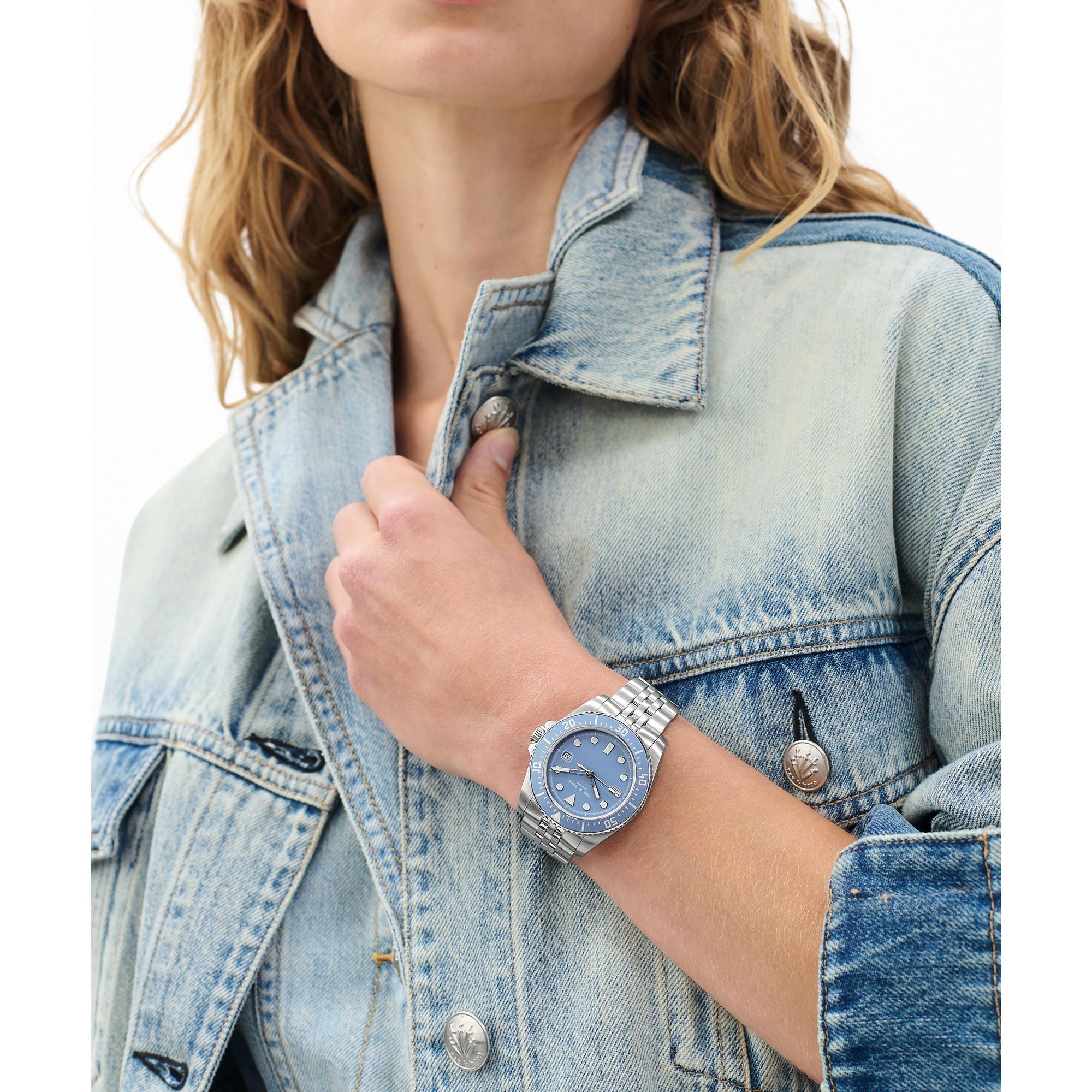 | Info: | Zeitlos und doch mit dem gewissen Etwas. Die Rowan interpretiert klassische Uhrmacherkunst neu: Das 38-mm-Gehäuse aus gebürstetem Recyclingstahl und die polierte, drehbare blaue Aluminiumlünette setzen einen reizvollen Kontrast. Das matte blaue Zifferblatt mit dezentem Datumsfenster bei 3 Uhr wirkt klar und elegant. Das einseitig gewölbte Saphirglas verleiht der Silhouette eine sanfte Note. Abgerundet wird das Design durch ein Armband aus gebürstetem und poliertem Stahl mit einer perfekt sitzenden Faltschließe. Sie ist elegant, unkompliziert und wie geschaffen für den Alltag. |