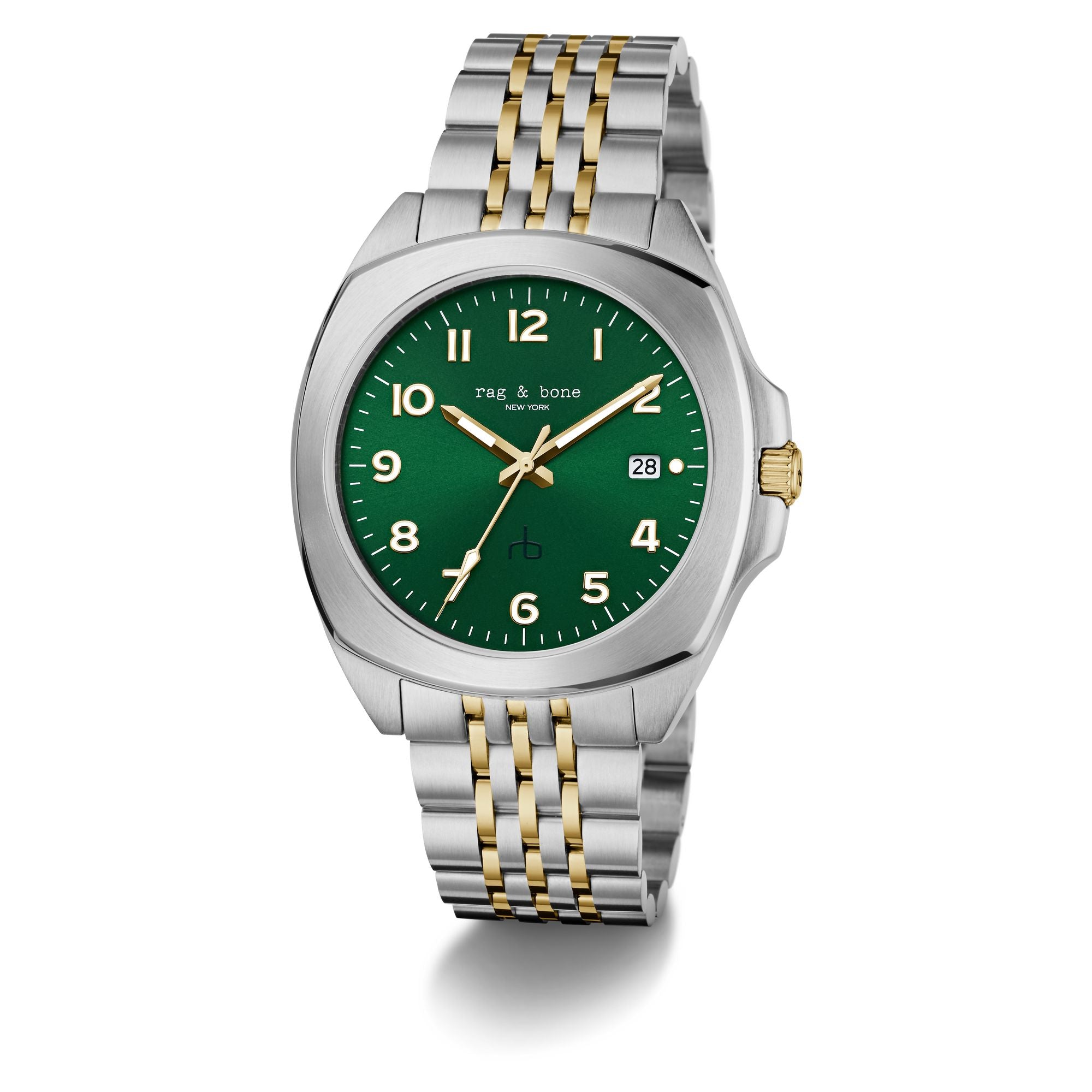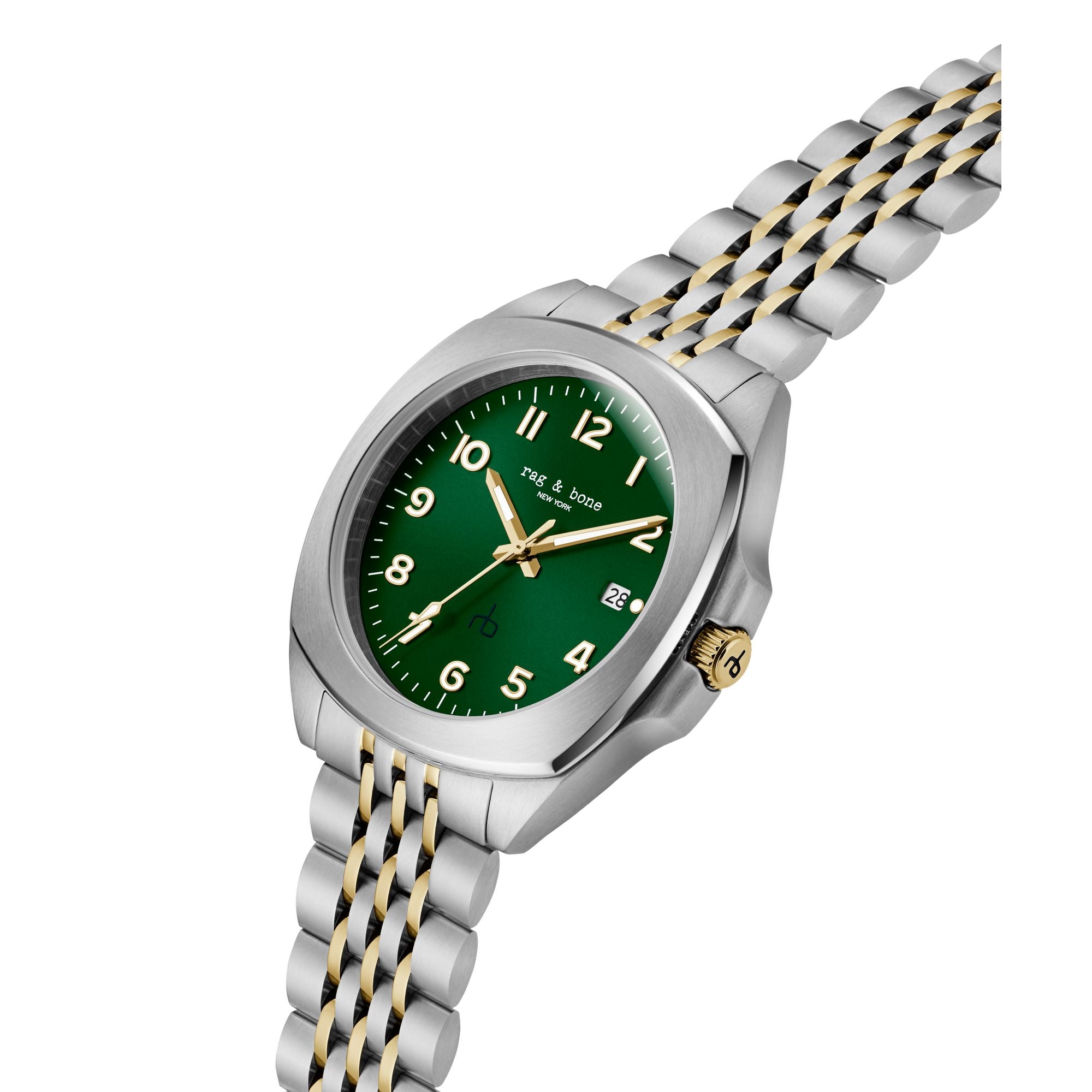 | Info: | Die klassische Bleeker besticht durch ihr Vintage-inspiriertes Gehäuse aus gebürstetem Recyclingstahl. Darunter befindet sich ein sattes grünes Zifferblatt mit Datumsanzeige bei 3 Uhr unter einem einseitig gewölbten Saphirglas. Die zusätzliche Funktion sorgt für ein klares Design und bietet ein ebenso praktisches wie dezentes Detail für jeden Tag. Ein zweifarbiges Armband aus gebürstetem und poliertem Stahl in Gold und Silber verleiht der Uhr eine edle Note und bietet hohen Tragekomfort. Das dezente Branding macht sie zu einem vielseitigen Begleiter für jeden Anlass. |