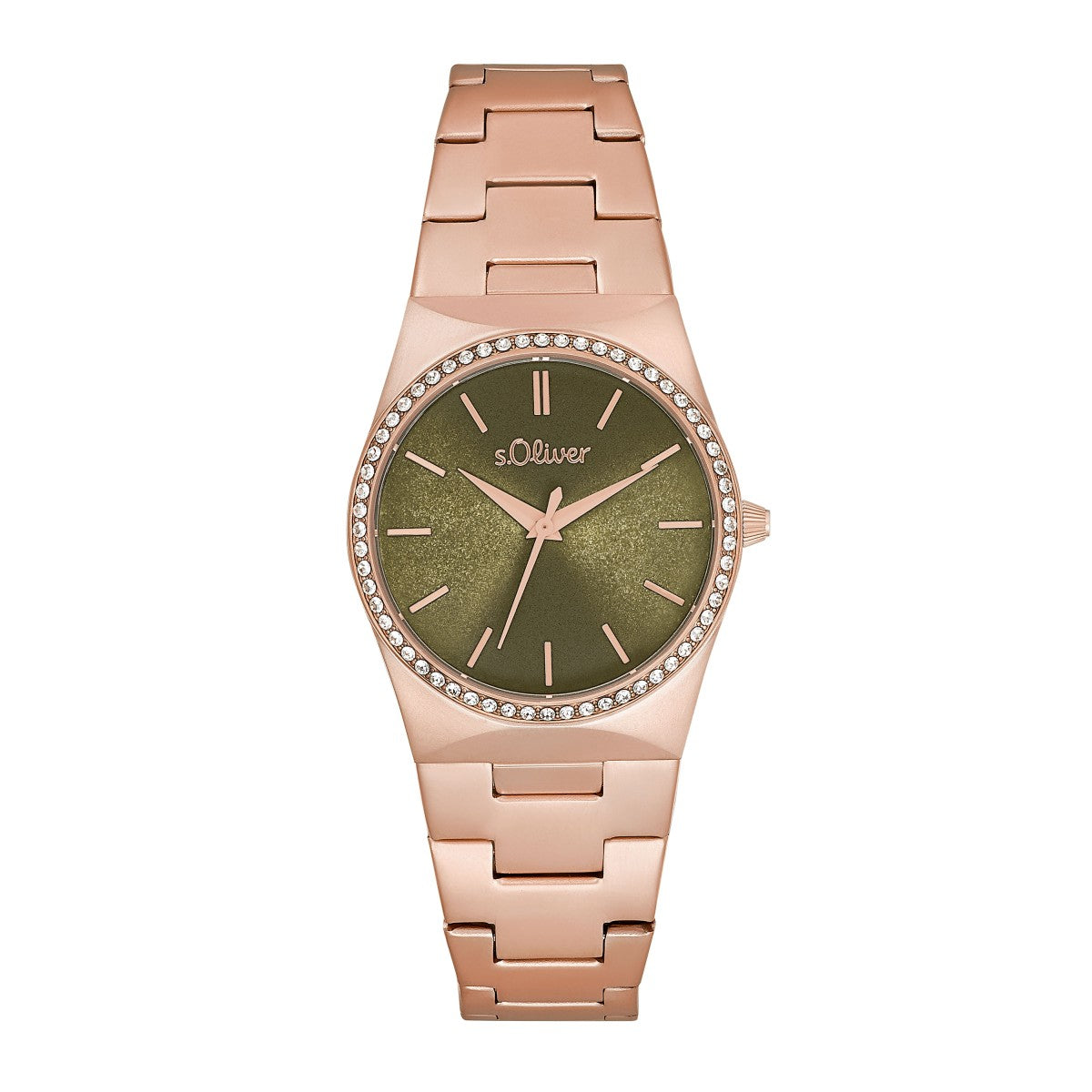 | Info: | Damen-Armbanduhr von s.Oliver. Diese funkelnde Armbanduhr von der Marke s.Oliver präsentiert sich im klassisch-modernen Design. Die Damenuhr aus der aktuellen Time Collection wurde aus hochwertigem Edelstahl gefertigt und mit einer IP Rose Beschichtung veredelt. Highlight und Blickfang der Damen-Armbanduhr sind die zahlreichen, strahlenden Zirkonia Steine in reinem Weiß, die das Gehäuse zieren. Das Armband hat eine Länge von 21,5 cm und ist einfach mit einem Klippfalt-Verschluss zu schließen. Dieser bietet dir Sicherheit beim Tragen deiner neuen Uhr. Die Damenuhr von s.Oliver ist ausgestattet mit einem hochwertigen Uhrwerk; das Ziffernblatt zeigt sich mit strahlendem Sunray-Effekt. Eine passende Komponente zu den funkelnden Steinen. Die roséfarbene Armbanduhr für Frauen ist wasserdicht bis zu einer Tiefe von 5 Bar. Trotz allem empfiehlt es sich, die Uhr vor dem Schwimmen oder weiteren Aktivitäten im Wasser ablegen. Die Frauen-Armbanduhr lässt sich gerne mit weiteren Accessoires wie Armbändern kombinieren. Trage die modische Uhr an deinem Business-Look oder ganz casual im Alltag. Der Zeitmesser für Damen aus Edelstahl kommt in einer passenden Uhrenbox und eignet sich somit auch als Geschenk |