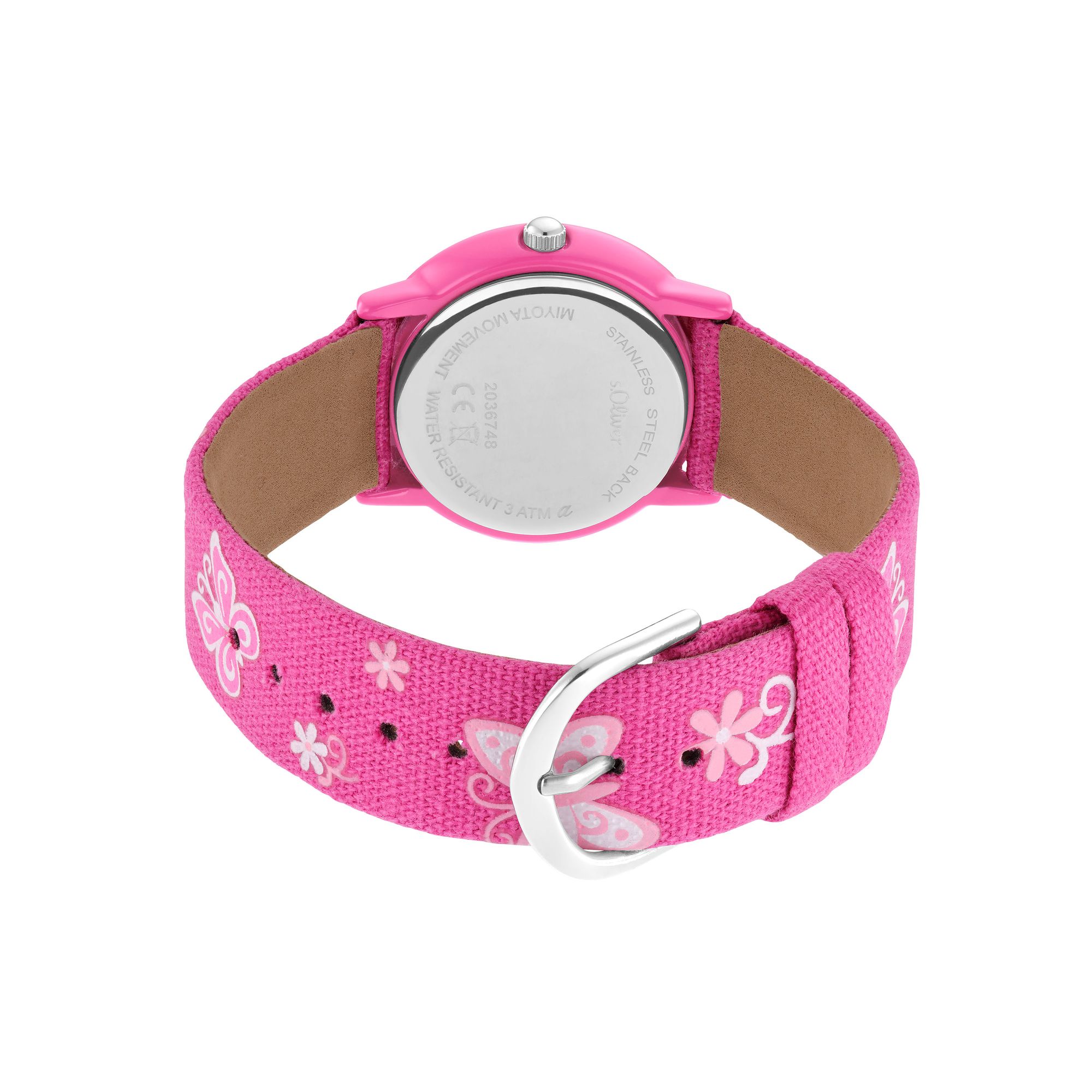 Kinderuhr von der bekannten Echtschmuckmarke s.Oliver. Diese Uhr für Mädchen zeigt sich farbenfroh mit Tiermotiv. Das Textilband umhüllt ein Gehäuse aus Alloy, das leicht und robust ist. Auf dem Ziffernblatt funkeln vier Kristall Schmucksteine (synth.). Die Mädchenuhr besitzt eine einfach verstellbare Dornschließe und ist bis auf 3 Bar wasserdicht. Die Uhr kommt in einer passenden Box, die sich zum Verschenken und Aufbewahren eignet. |