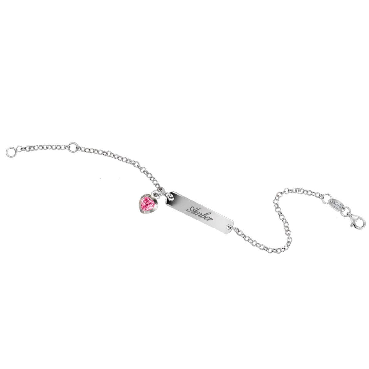 | Material: | exclusives Mädchen Armband (Armkettchen) aus 925/-Sterlingsilber rhodiniert , mit Schmuckstein verziert, (Farbe silber, pink), Gravurplatte |