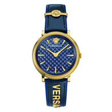 | Zifferblatt: | Analoganzeige, Farbe: blau mit Versace Logo und goldfarbene Zeiger / Indexe |