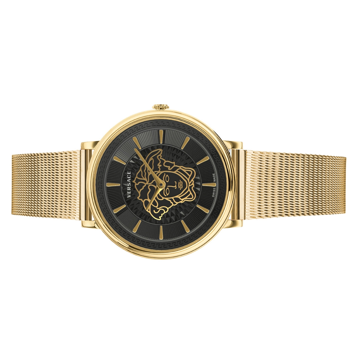 | Zifferblatt: | Analoganzeige, Farbe: schwarz mit Versace Logo und goldfarbene Zeiger / Indexe |