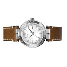 | Zifferblatt: | Analoganzeige, Farbe: silber mit Versace Logo, silberfarbige Zeiger und Indexe |