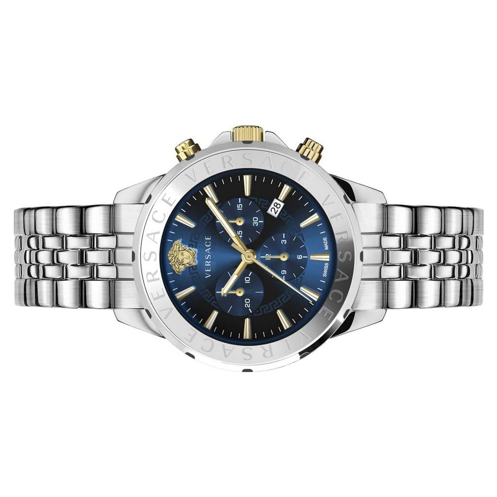 | Zifferblatt: | Analoganzeige, Farbe: blau mit Versace Logo |