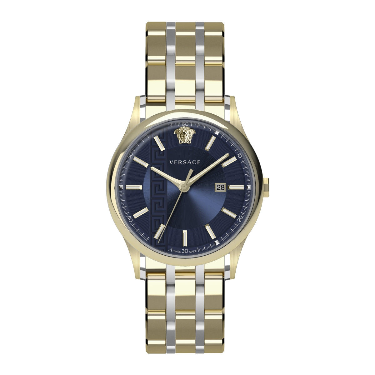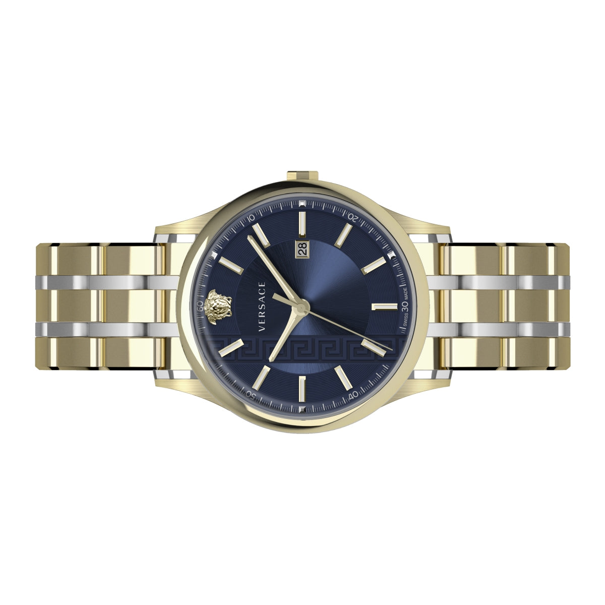 | Zifferblatt: | Analoganzeige, Farbe: blau mit Versace Logo |