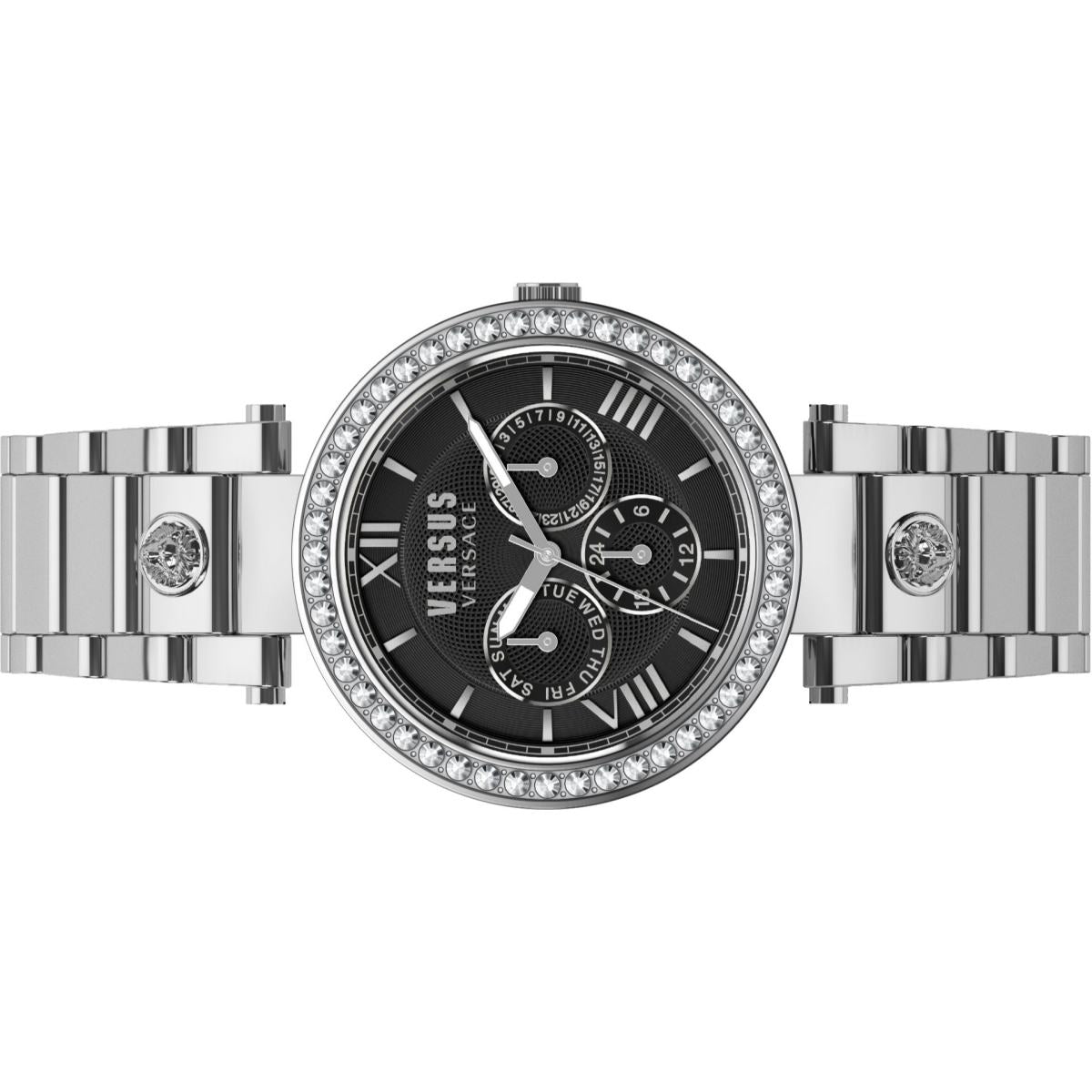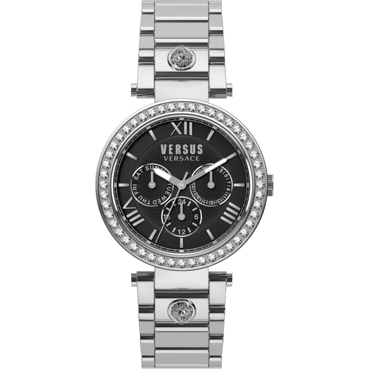 | Zifferblatt: | Analoganzeige, Farbe: schwarz mit Versus by Versace Logo und silberfarbigen Zeiger / Indexe |