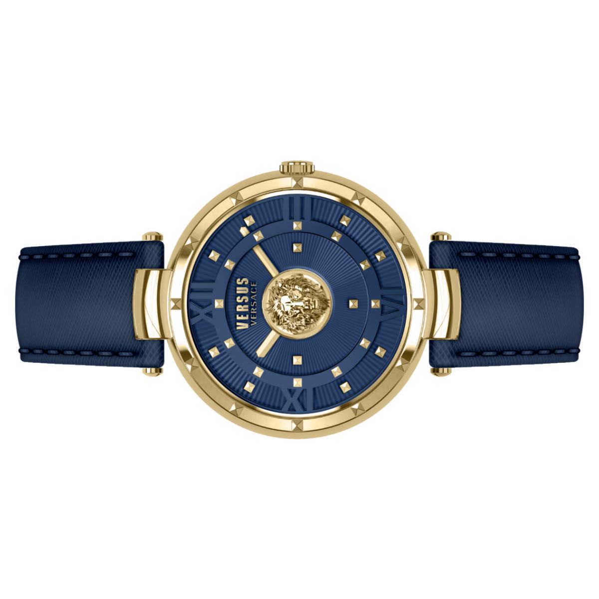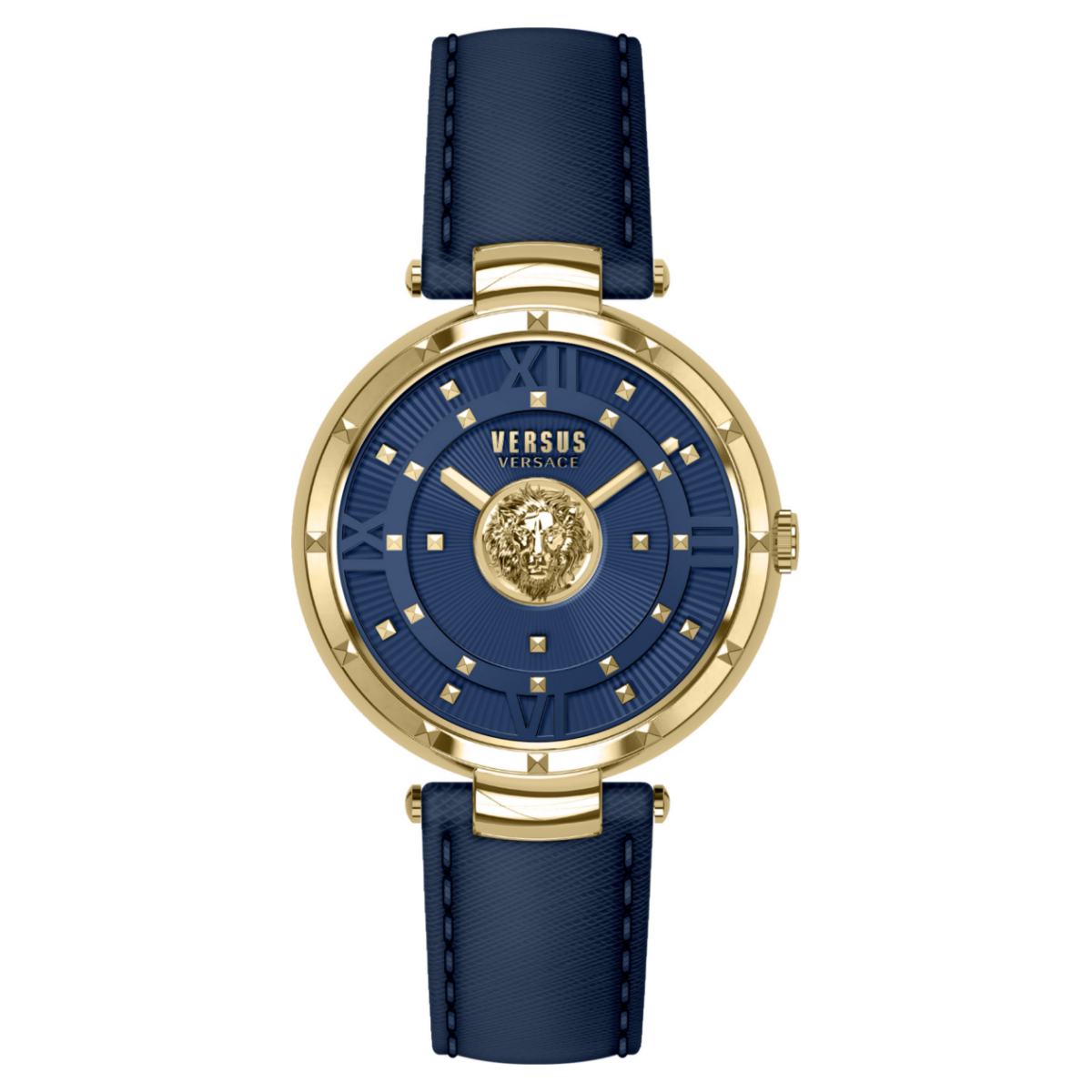 | Zifferblatt: | Analoganzeige, Farbe: blau mit Versus by Versace Logo und goldfarbigen Zeiger / Indexe |
