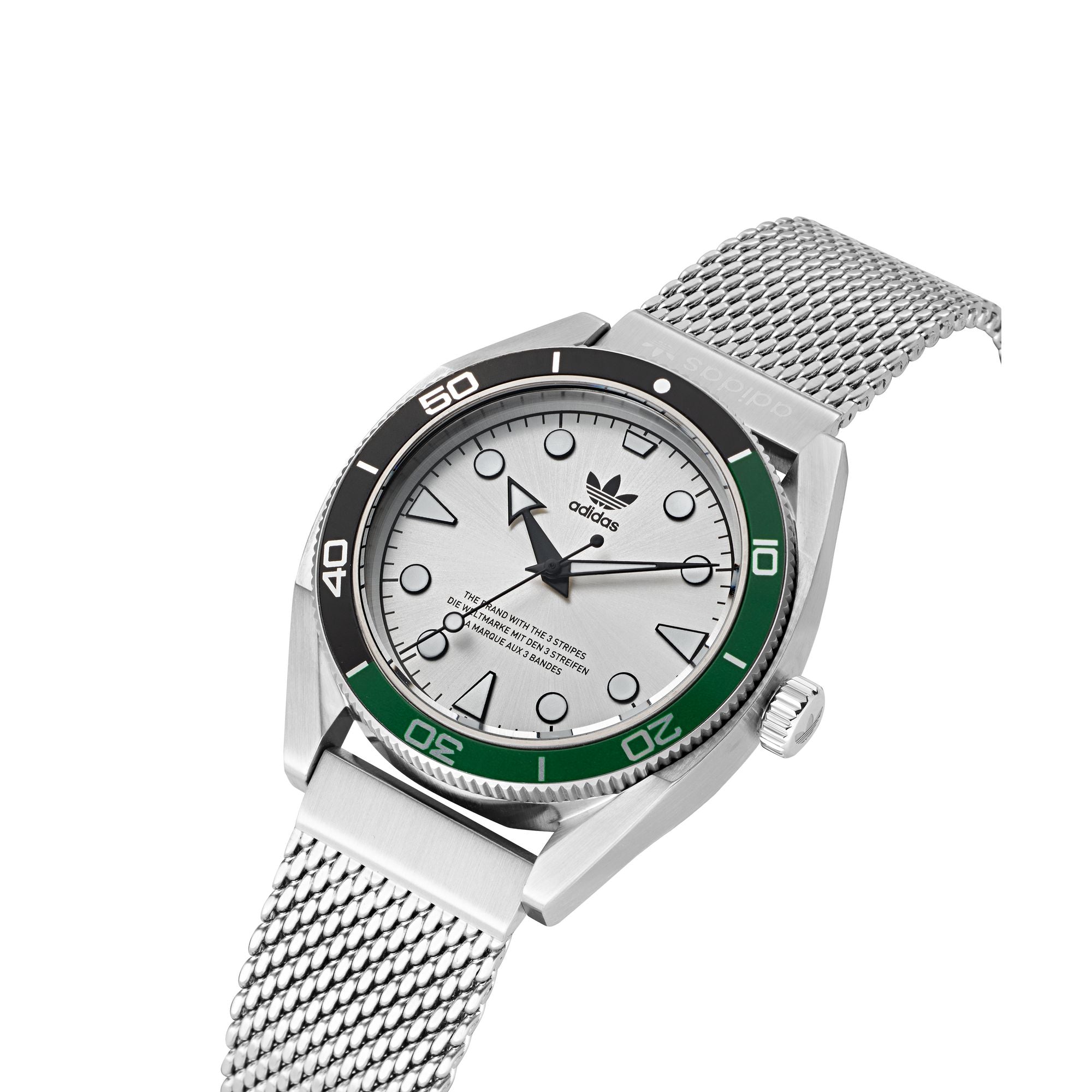 | Gehäuse: | Edelstahlgehäuse silberfarben, Lünette schwarz/grün , Durchmesser ca. 43 mm (ohne Krone), Höhe: ca. 11 mm |