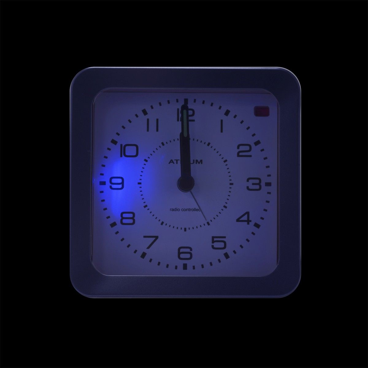 | Der ATRIUM Funkwecker zeichnet sich aus durch ein klassisches und zeitloses Design aus. Er empfängt das Signal über den deutschen Zeitzeichensender DCF77. Die Zeiteinstellung, sowie Umstellung von Sommer- und Winterzeit erfolgen automatisch. Die eckige Form in dunkelblau metallic mit silberfarbenen Bedienelementen und das schlichte Zifferblattdesign, verleihen ihm sein dezentes und schickes Aussehen. Die Besonderheit bei dem Wecker ist die rote Alarmbereitschaftsanzeige. Ist der Alarm eingeschaltet, ändert sich die Anzeige auf dem Zifferblatt in Rot. Die großen Zahlen in Schwarz tragen zur guten Ablesbarkeit bei. Das Wecksignal ist ein deutlich hörbarer, vierstufig ansteigender Piepton, wahlweise kann dabei die Snooze-Funktion (Weckwiederholung) aktiviert werden. Mit dem obigen Knopf wird auch das Zifferblatt blau beleuchtet, nach 5 Sekunden geht das Licht automatisch aus. Als modernes Dekoelement im Schlaf- oder Arbeitszimmer ist er auch als Tischuhr ein schöner Blickfang und ideal als Geschenk zu jedem Anlass. | |